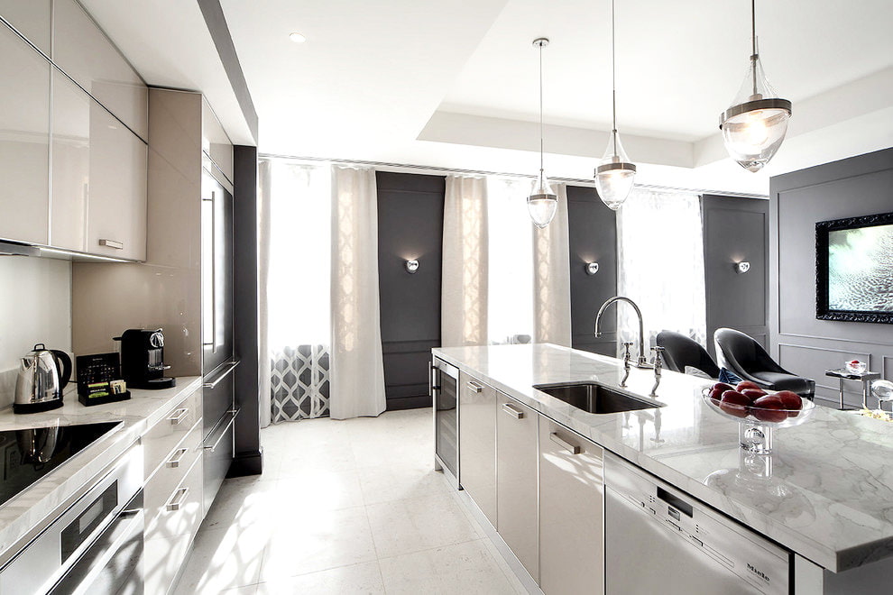 - Un classique où vous pouvez librement compléter l'intérieur avec des détails argentés et dorés, en mettant l'accent sur les accents gris, et faire des carreaux au sol sous une pierre chère de haute qualité.