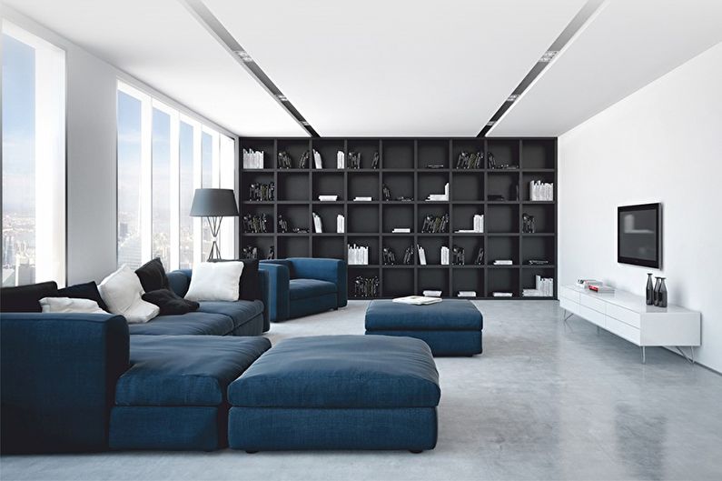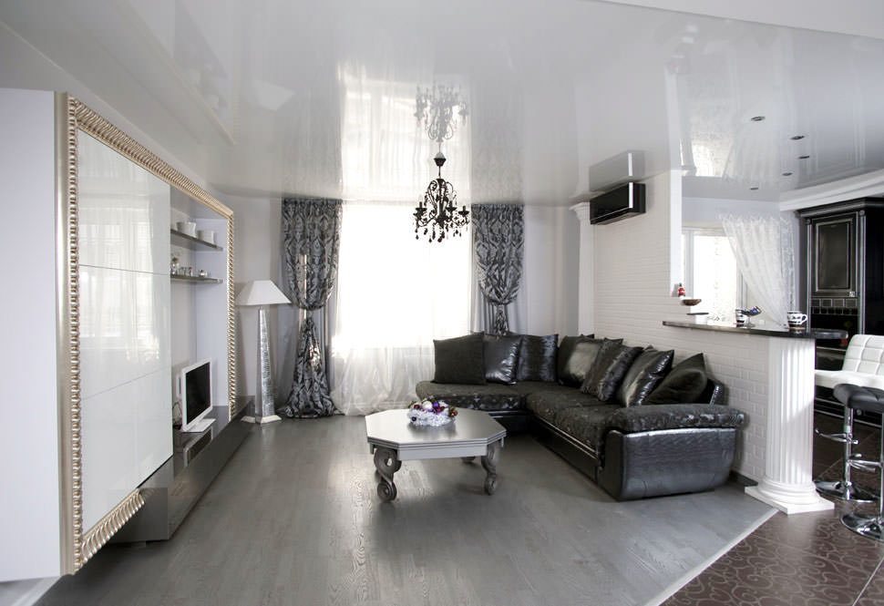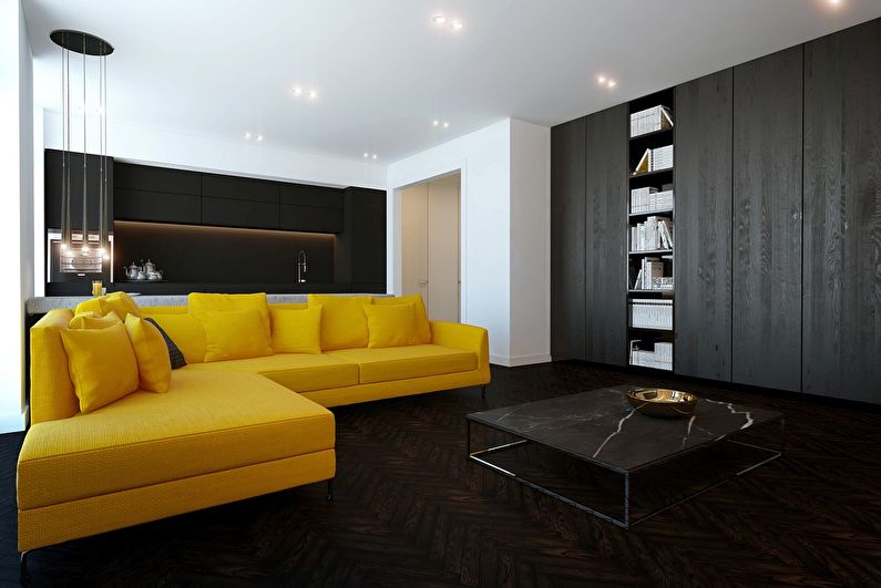 L'utilisation du noir et blanc dans le salon est considérée comme une excellente solution. Le duo dans les studios, où la cuisine est reliée au hall, est extrêmement bénéfique: une combinaison contrastée sera bénéfique pour zoner l'espace. Une combinaison compétente de tons complétera les accessoires sélectionnés pour le style.