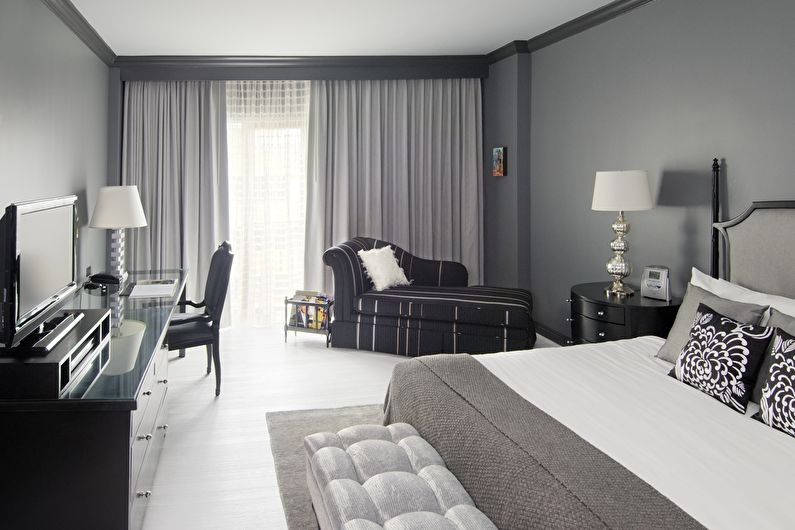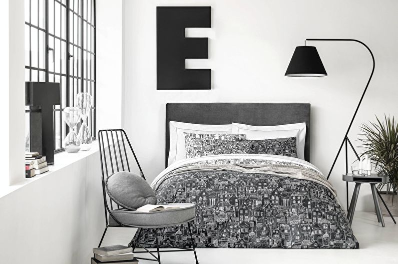 L'intérieur de la chambre en noir et blanc ne doit pas être trop net, car la pièce est conçue pour une détente calme et un repos nocturne.