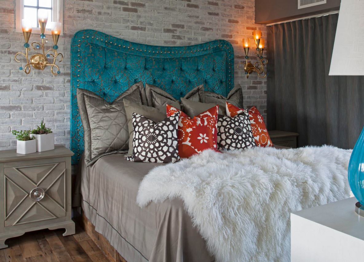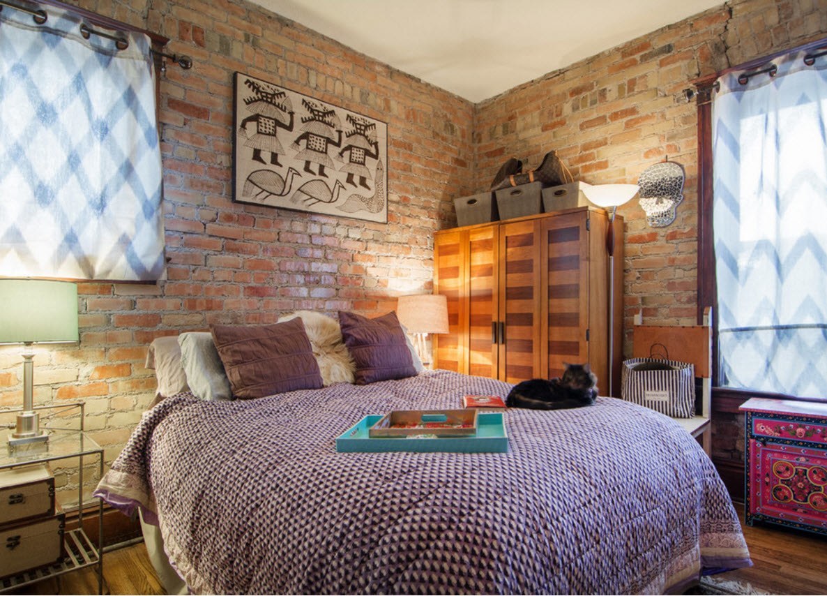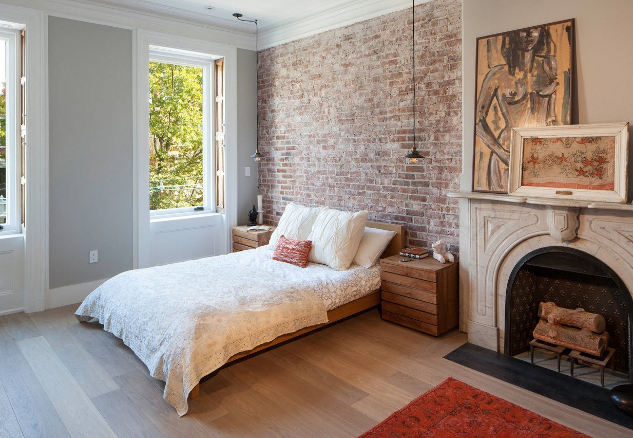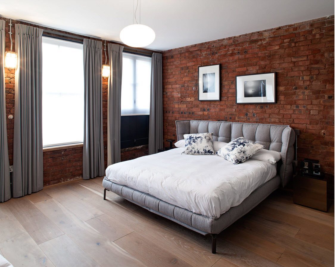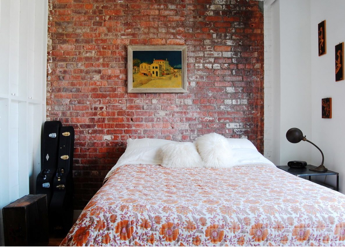 L'une des façons les plus courantes d'utiliser un mur de briques dans une chambre est de concevoir la surface derrière la tête du lit.