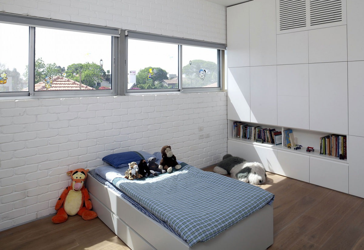 Afin de ne pas perturber l'atmosphère de calme, un mur de pierre est réalisé au-dessus de la tête du lit. Vous pouvez vous concentrer dessus en devenant rouge, ou vous pouvez le blanchir pour qu'il s'harmonise avec le reste de l'intérieur.