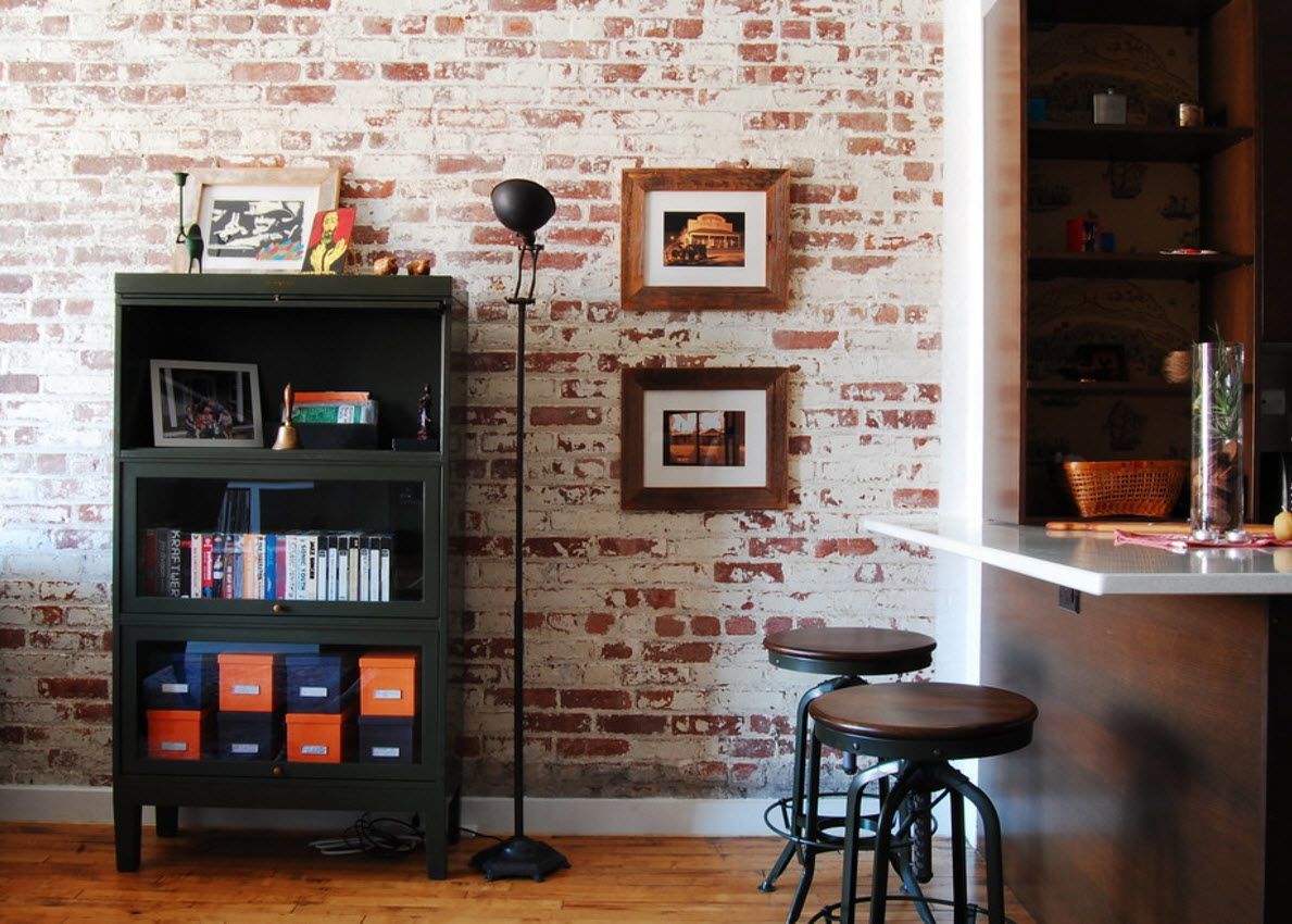 L'abat-jour standard pour la pierre, qui est largement utilisé à l'intérieur. Les briques ne nécessitent pas de traitement supplémentaire, en plus, elles se marient bien avec n'importe quel style et vous permettent de vous concentrer sur le mur.