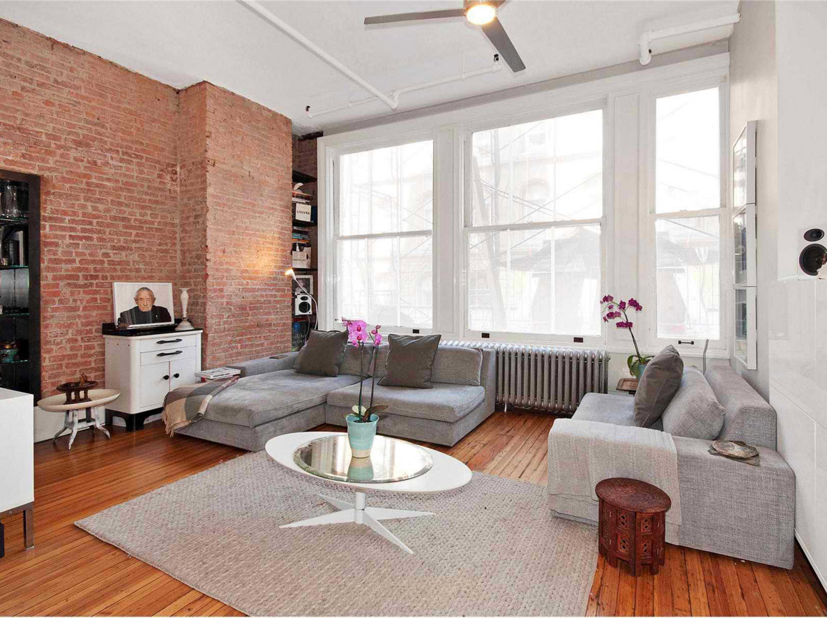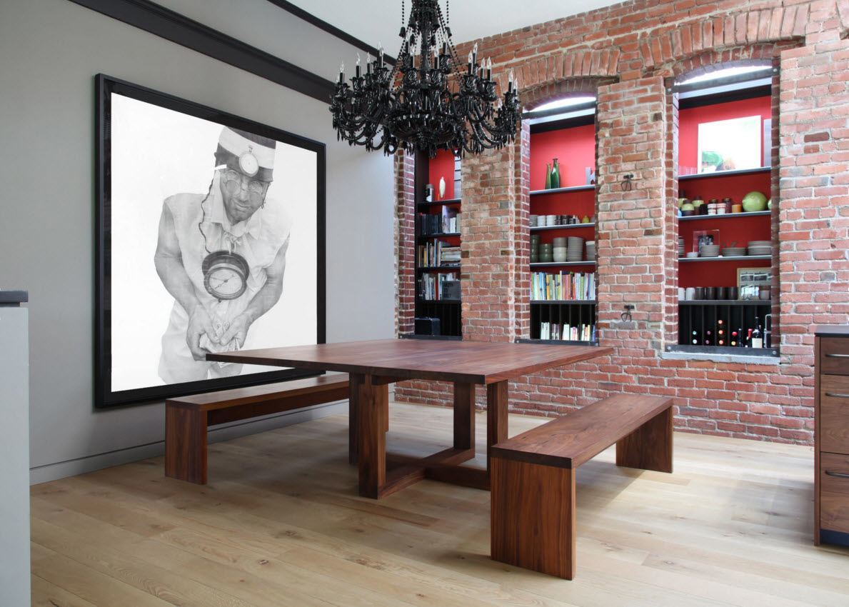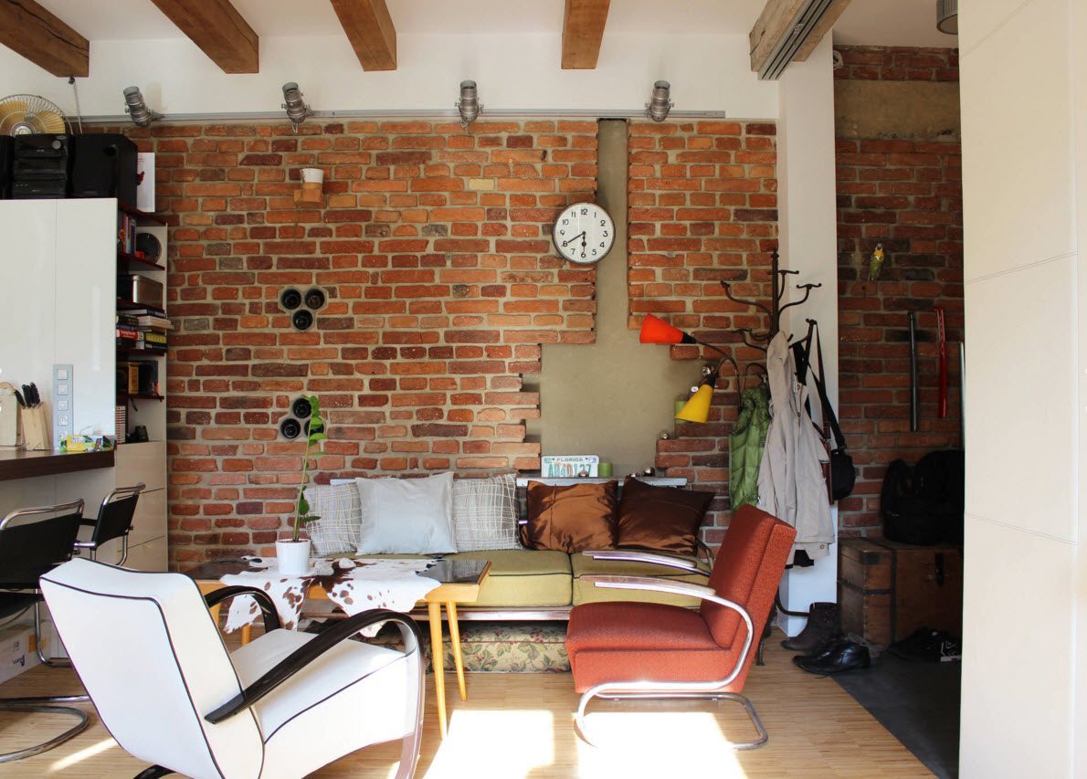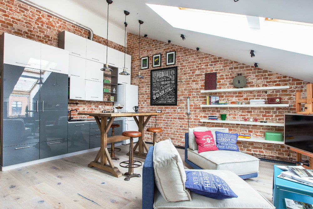 Pour «soutenir» l'utilisation d'un mur de briques comme surface d'accentuation, vous pouvez appliquer d'autres solutions de conception spécifiques au style loft.