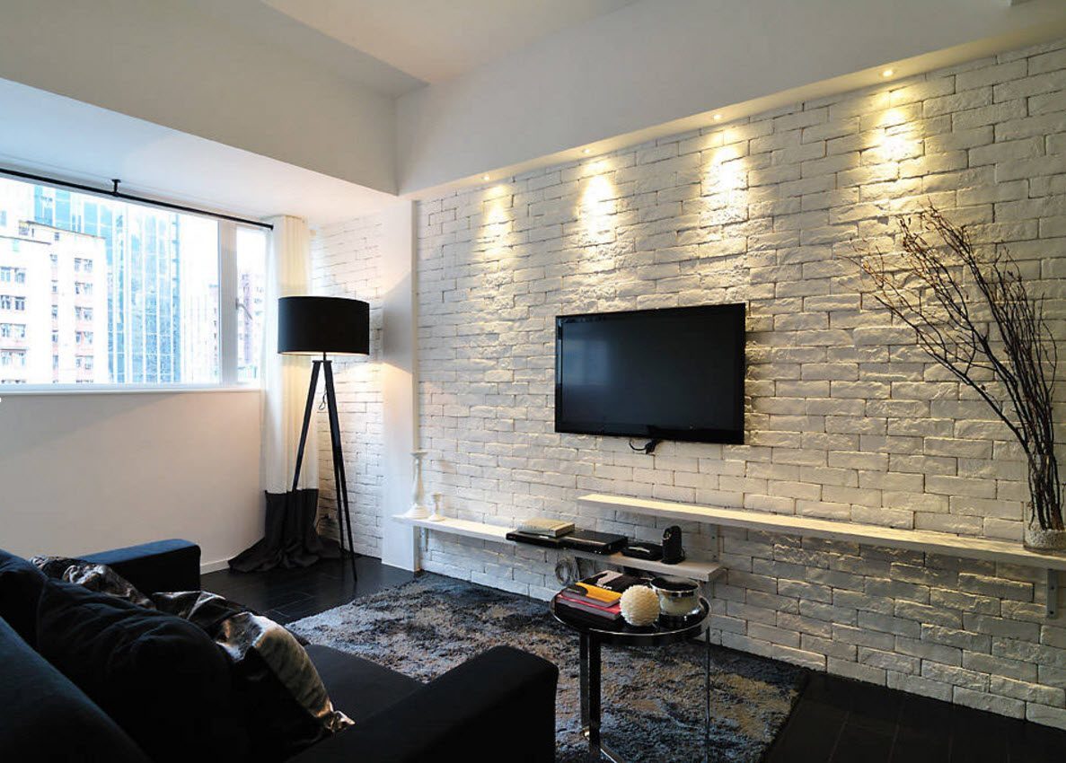 Pour créer un intérieur contrasté du salon avec des meubles et des appareils sombres, la maçonnerie peinte en blanc sera une option idéale pour la conception de murs d'accent.