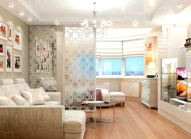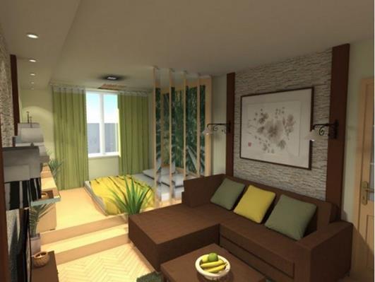 Le zonage «invisible» est la séparation de l'espace due aux différentes couleurs des revêtements de sol et muraux. Dans le cas d'un petit appartement d'une pièce - c'est tout.