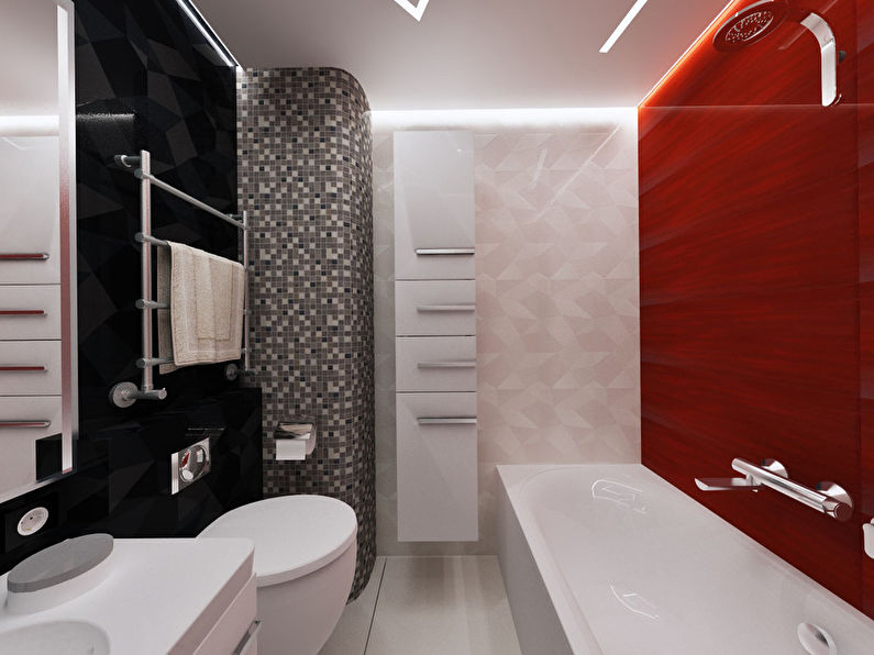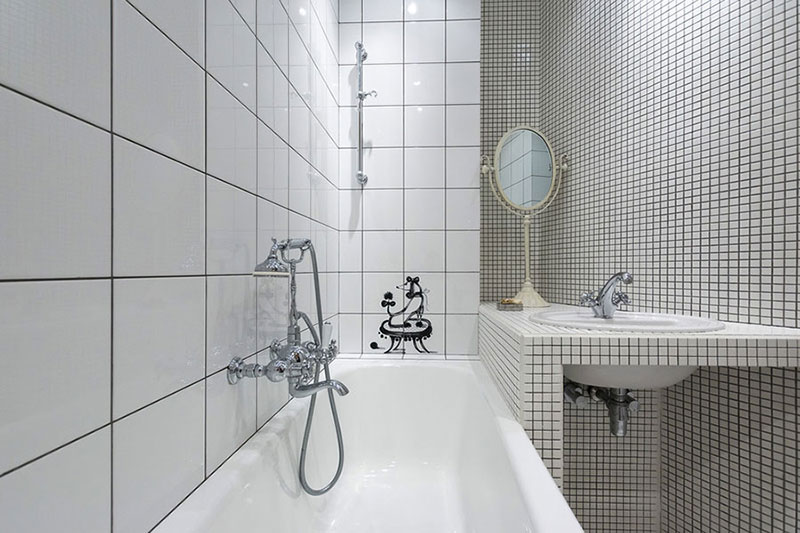 - Dans la salle de bain. Jouez en contraste - une tuile claire avec une mosaïque, des accessoires lumineux, une plomberie blanc comme neige.