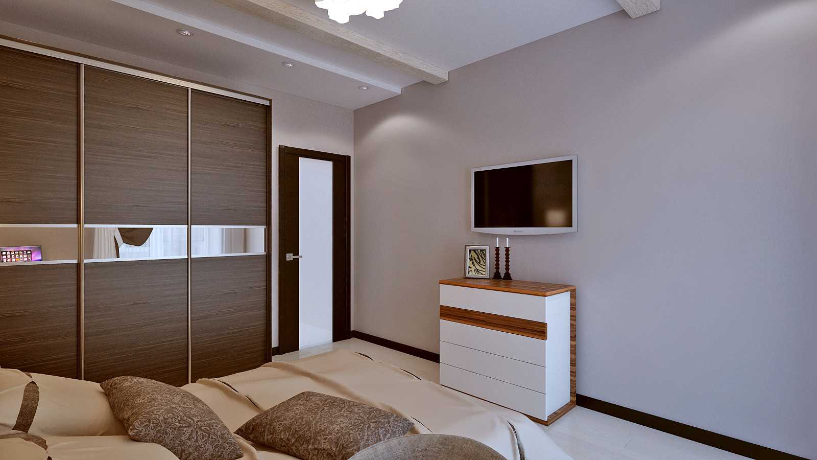 - Dans la chambre. Murs pastel et plafond blanc - harmonieusement, confortablement. Le sol est un peu plus foncé. Meubles sombres et rideaux élégants - rien de plus.