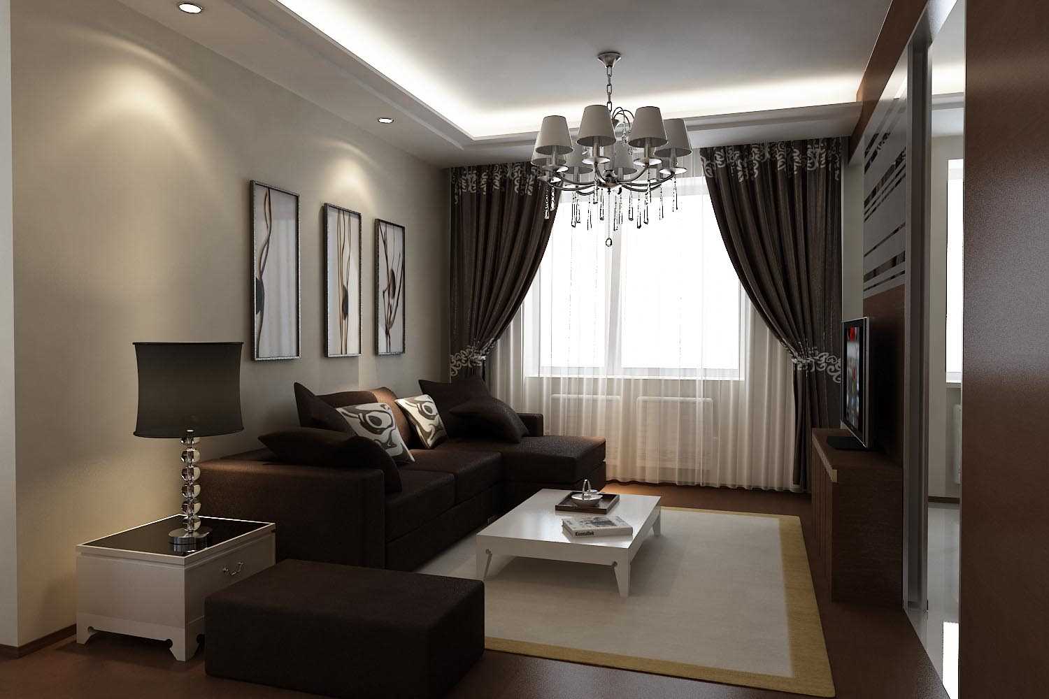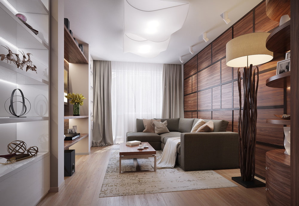 - Dans le salon. La partie principale de la pièce se fait dans des tons clairs, la seconde moitié est plus sombre. Vous pouvez étendre le sol stratifié du couloir, mettre un tapis doux dans la pièce. Sur les canapés, mettez des oreillers lumineux pour le contraste, décorez les murs avec des peintures.