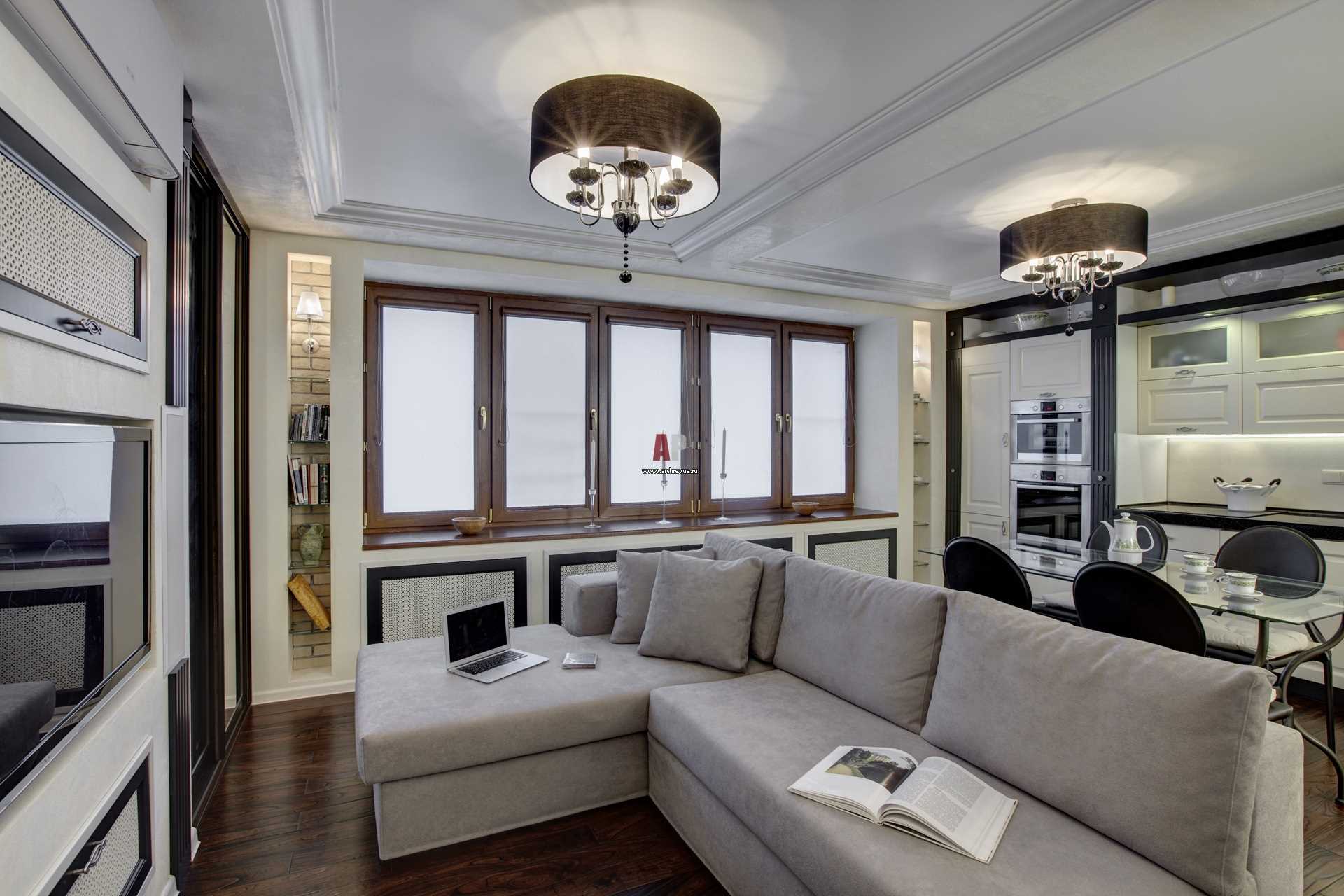 Ici, vous pouvez connecter le salon, la cuisine et la pièce - vous obtenez un studio multifonctionnel. La combinaison de deux zones résidentielles est pratique et bénéfique pour augmenter la superficie totale. Dans une telle pièce, vous pouvez recevoir des invités et faire un grand espace pour toute la famille.