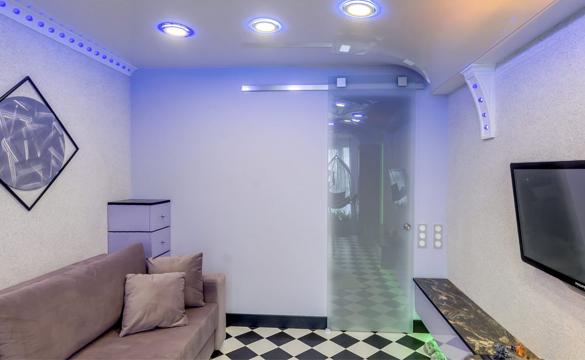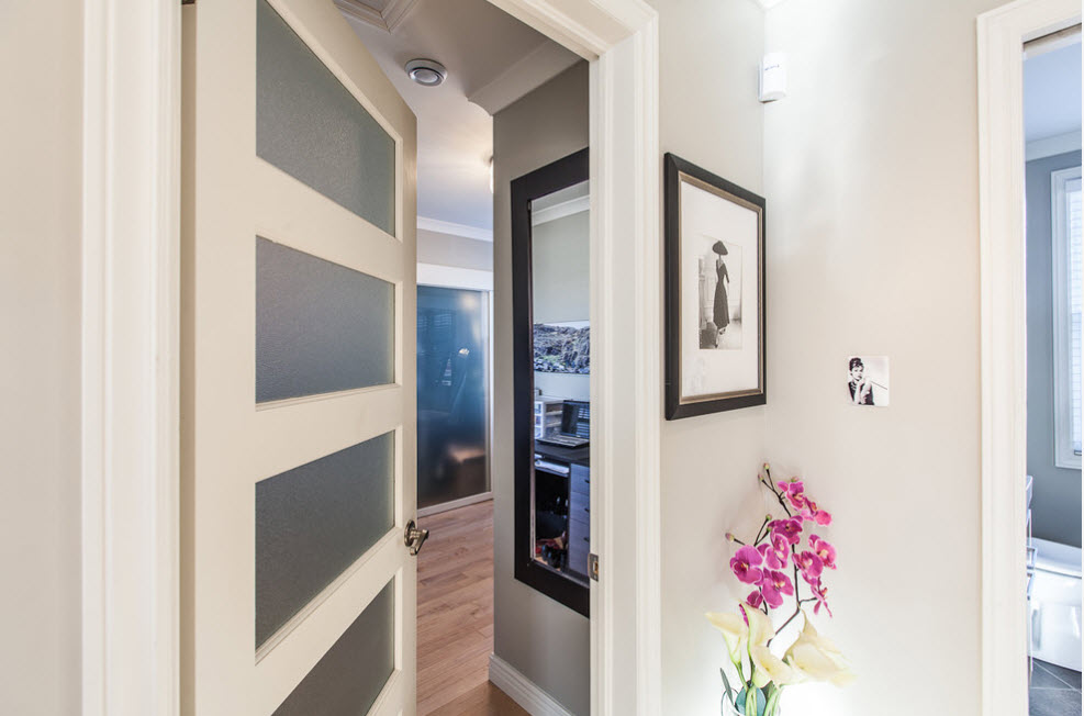 - Portes vitrées. Les portes et les cloisons en verre de l'appartement transmettent parfaitement la lumière, augmentent visuellement la pièce, ajoutent légèreté et légèreté. Ils ont un grand nombre de variations d'apparence et vous pouvez également leur appliquer une impression photo. L'inconvénient est que des empreintes de mains peuvent rester sur la vitre. Et ils sont également d'un coût élevé.