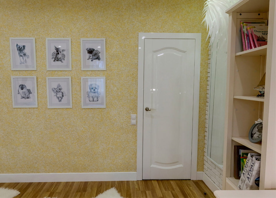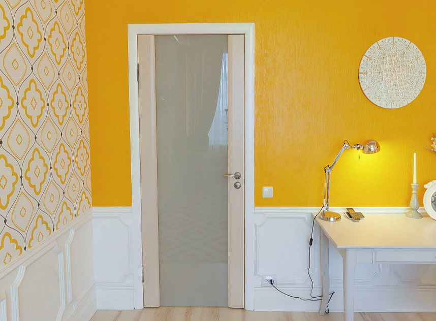 La couleur des murs de la pièce affecte également grandement le choix de la couleur de la porte. Ressemble parfaitement à des couleurs de murs et de portes absolument identiques et contrastées. La porte sera également belle, ne différant que de quelques nuances de la couleur des murs.