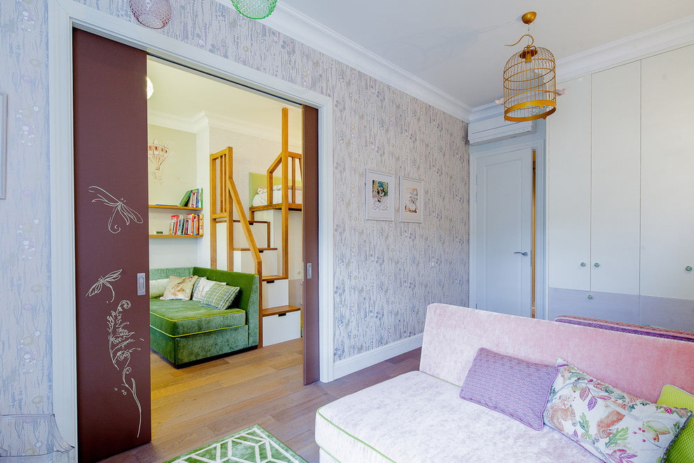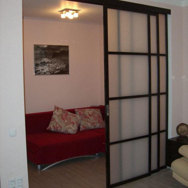 La porte coulissante dans le salon sera très pertinente, surtout lorsque les invités se sont réunis dans le salon et que vous devez séparer les espaces des autres salons sans perdre d'espace libre, où, par exemple, les enfants peuvent se détendre à ce moment-là.