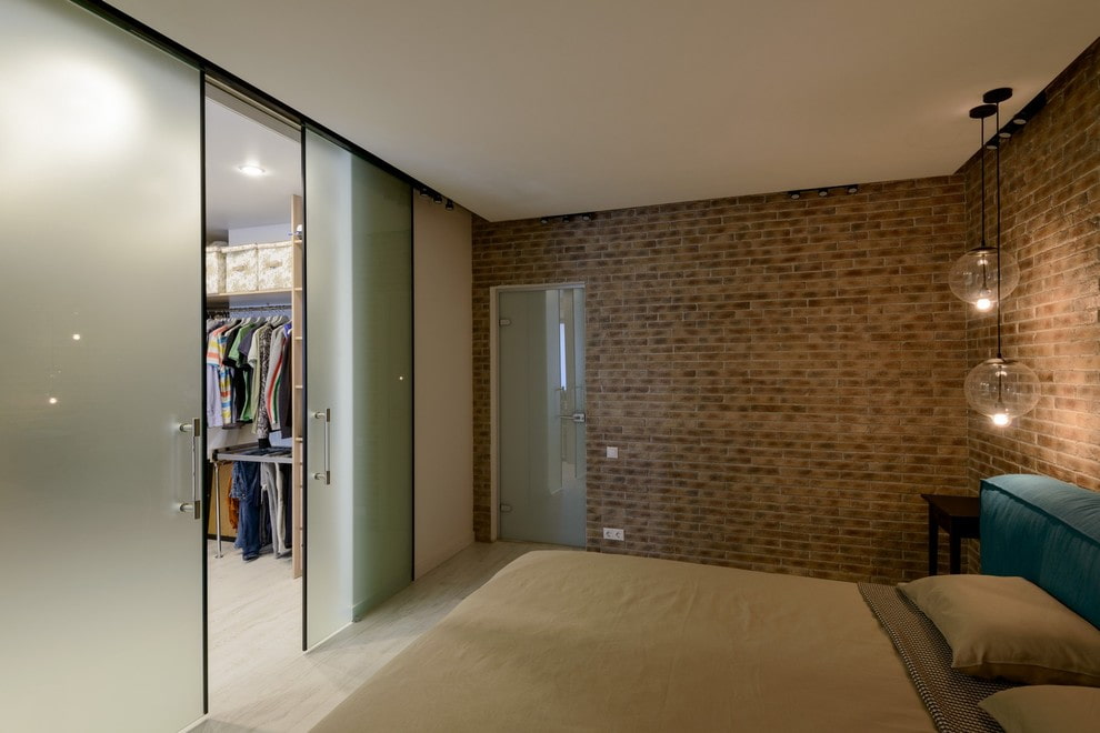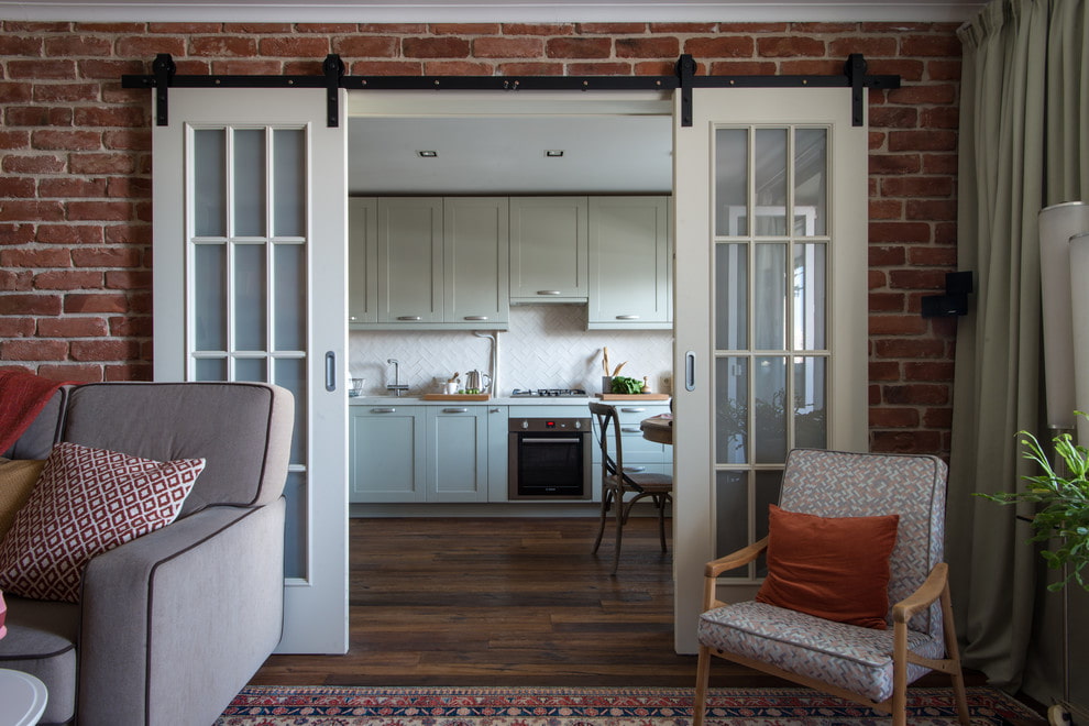 Porte coulissante à une porte à l'intérieur de la cuisine avec mur de briques