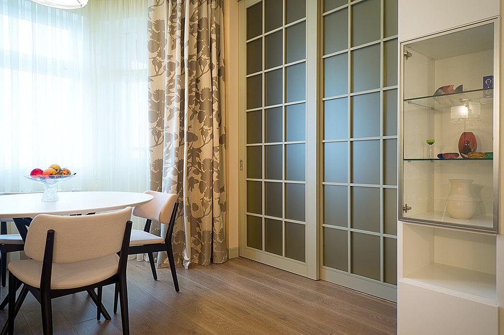 Des portes coulissantes peuvent être installées dans d'autres types d'appartements. Avant de commencer ce travail, vous pouvez vous familiariser avec une sélection d'exemples sur le thème «Portes coulissantes à l'intérieur d'un appartement, photo».