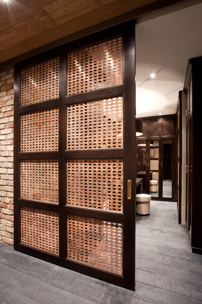 - Une telle conception peut servir non seulement de porte, mais également d'élément de zonage qui délimite l'espace entre différentes pièces ou zones d'une même pièce. Cette solution est particulièrement pertinente pour les appartements en studio ou en studio. Dans de tels locaux, il est difficile de réaménager de telle sorte que chaque membre de la famille dispose d'un espace personnel et les cloisons pourront y faire face.