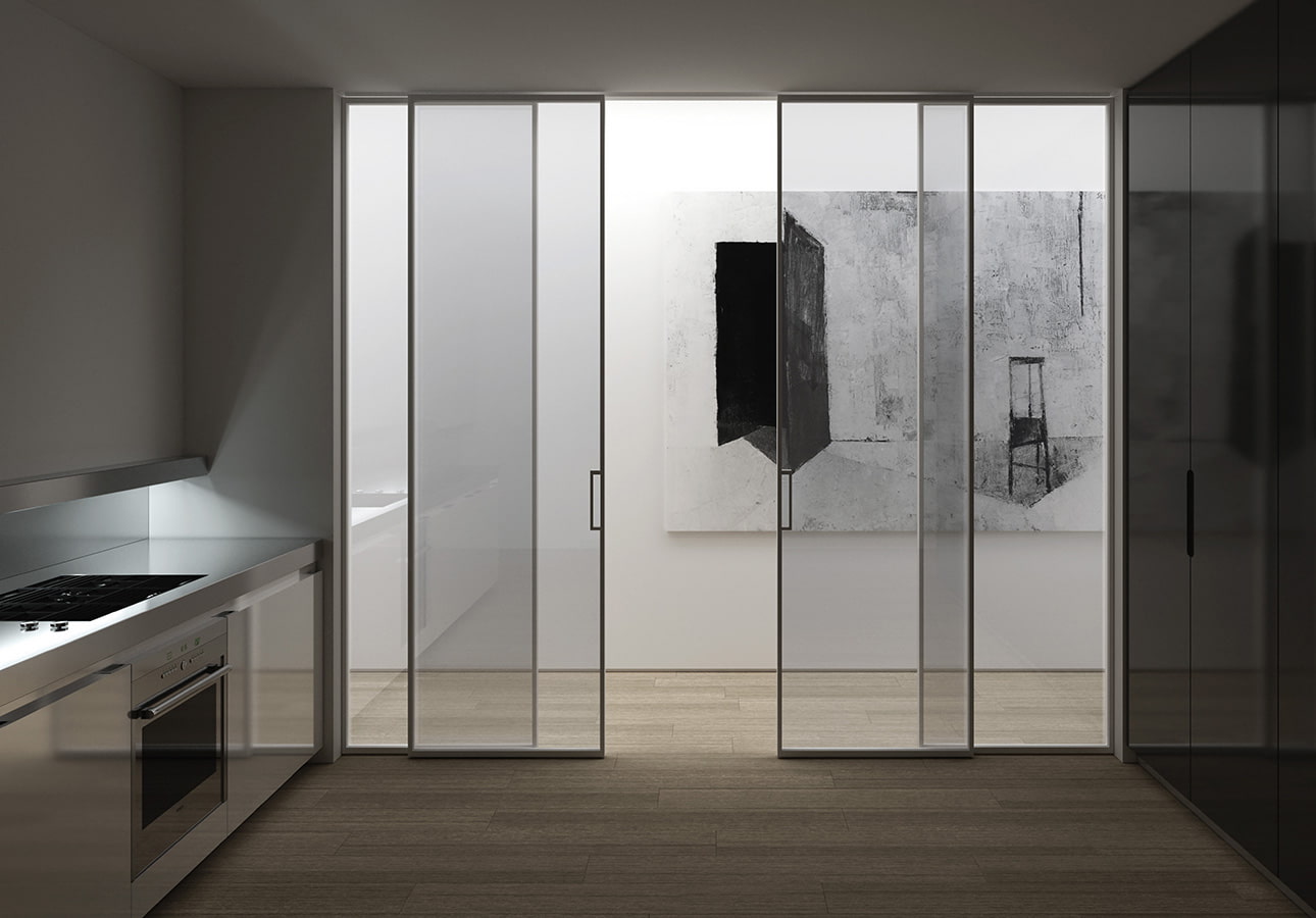 Portes coulissantes transparentes entre la cuisine et le couloir