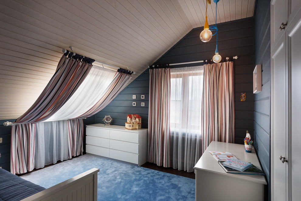 - Rideaux. Dans une maison privée, où il y a beaucoup de fenêtres, les rideaux doivent être sélectionnés correctement. Puisque la maison est au niveau des arbres et des buissons, il est préférable de choisir dans des tons naturels et doux pour que la lumière passe bien à travers eux.