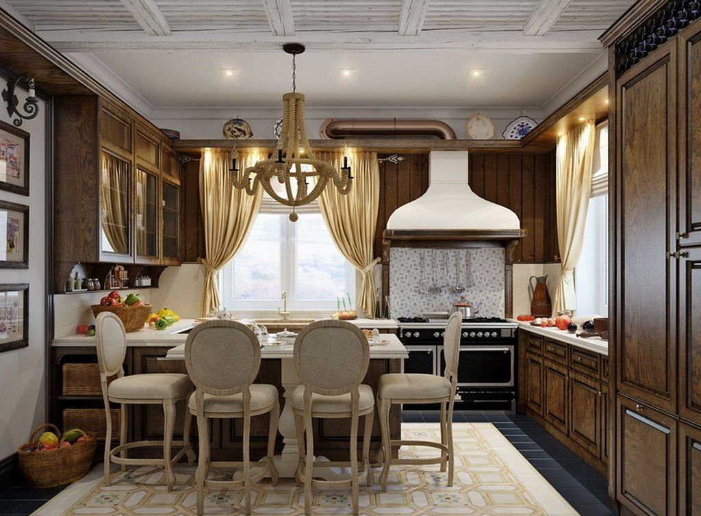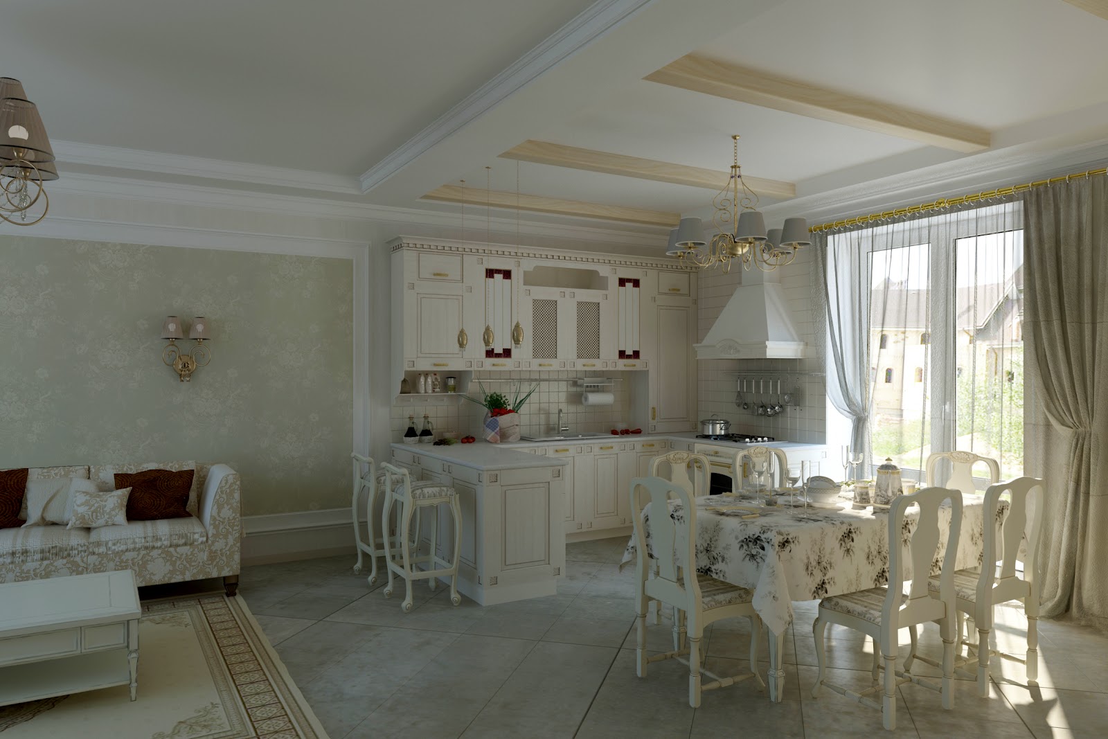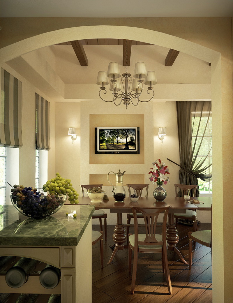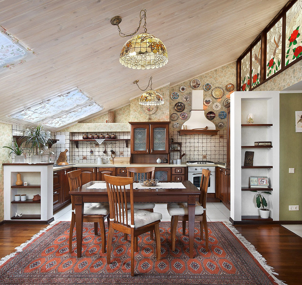 Une telle pièce peut être spacieuse ou petite, un passage ou avec un grenier. Si la maison est petite, vous pouvez acheter du matériel intégré. Placez la table dans le coin, près de la fenêtre et plusieurs chaises à proximité. S'il y a un grand espace dans la pièce, vous pouvez mettre une grande table à manger au milieu et de belles chaises autour.