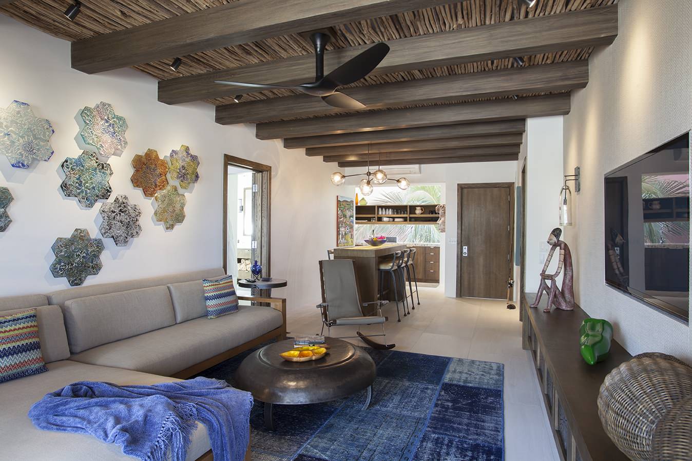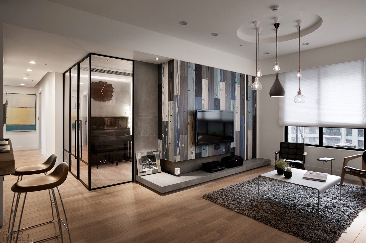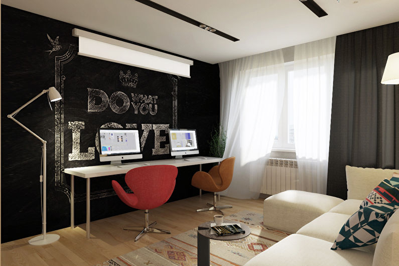 Intérieur de studio de style fusion avec des accents sombres sur un fond clair.