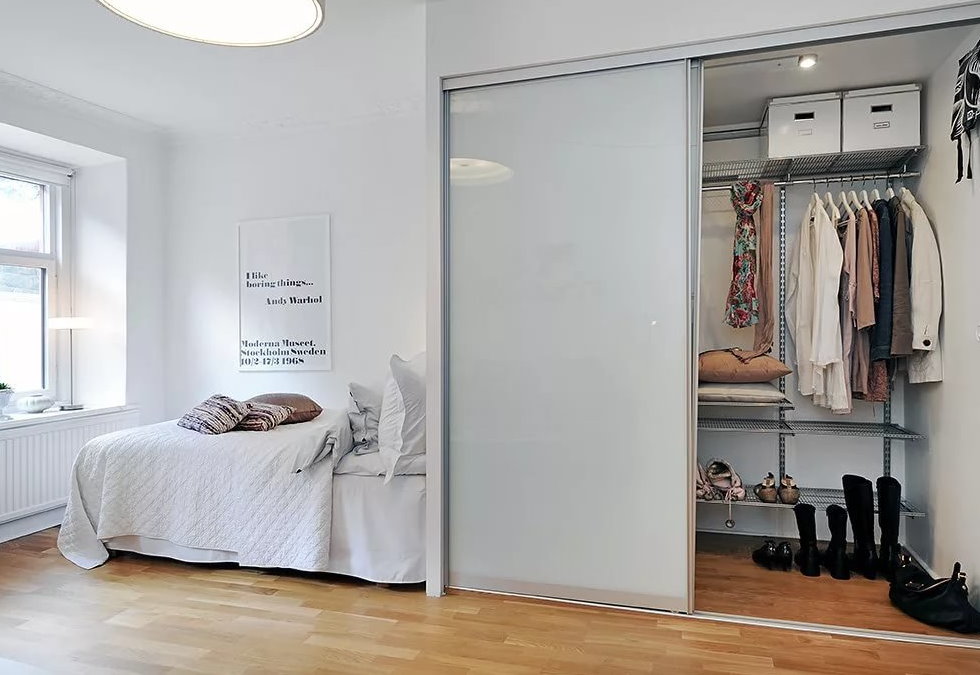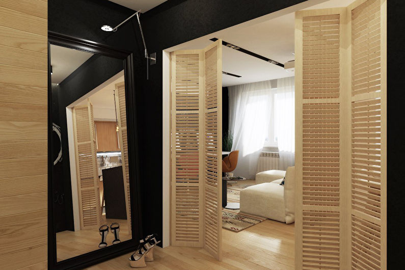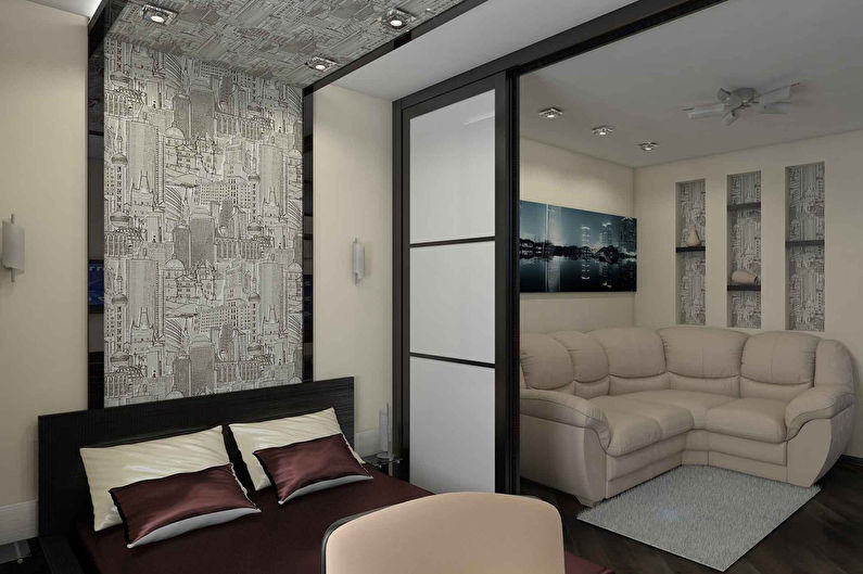 - Armoire coulissante. Une armoire dans un petit appartement d'une pièce joue un rôle de premier plan dans sa conception parmi les meubles d'armoires. Grâce à sa conception, il vous permet de stocker un grand nombre de choses et ne prend pas trop de place. Les portes coulissantes ne bloquent pas les allées étroites et une variété de modèles vous permet de prendre des décisions de conception audacieuses.