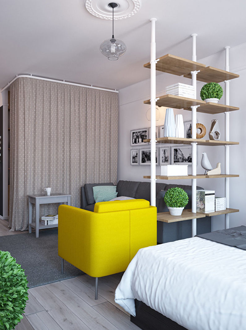 Avant de disposer des meubles dans un appartement d'une pièce, vous devez envisager de diviser l'espace de vie en zones. À ces fins, vous pouvez utiliser des partitions sous forme de racks ou de podiums avec des objets placés dessus.