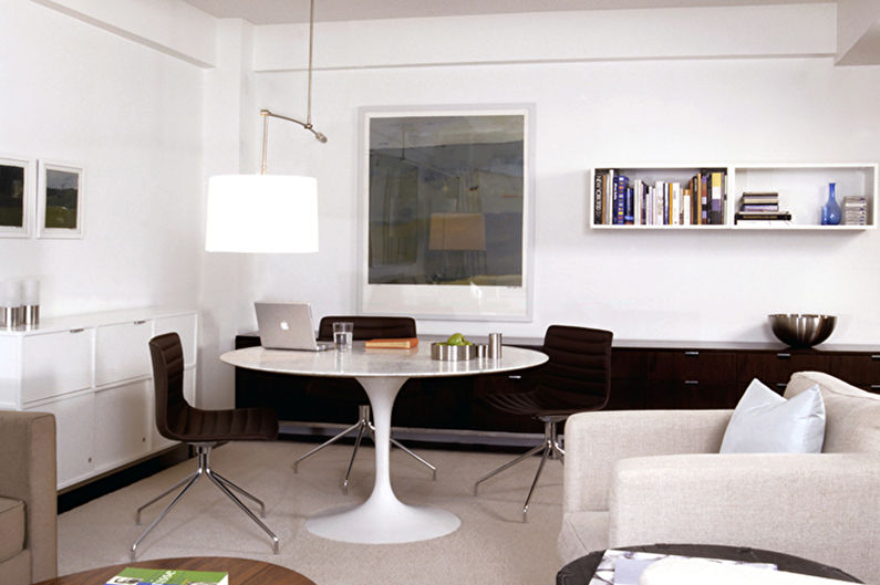 - Tables et étagères. Une table pliante est un élément de mobilier très populaire dans les appartements d'une pièce. Si nécessaire, de nombreux proches peuvent dîner en même temps. Plié, il s'agit soit d'un meuble compact soit d'une table plus petite, pouvant accueillir de deux à trois personnes. Les étagères rétractables sont également très pratiques avec un nombre limité de séquences.