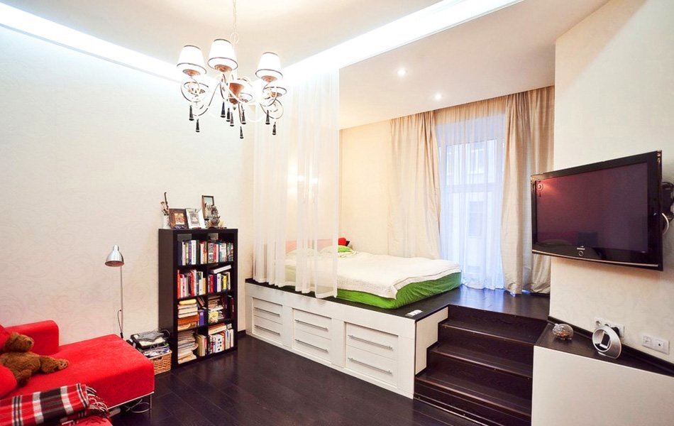 - Podium - les propriétaires d'appartements avec de hauts plafonds peuvent y placer une salle à manger, un bureau ou un salon. Ceux avec des plafonds bas - une chambre, c'est mieux. Une telle colline sert de lieu supplémentaire et peut servir de garde-robe. Grâce aux tiroirs, des vêtements ou des chaussures peuvent être stockés ici. Le point positif du podium est qu'il ne prend pas beaucoup de place. C'est aussi un bon point culminant d'une certaine zone.