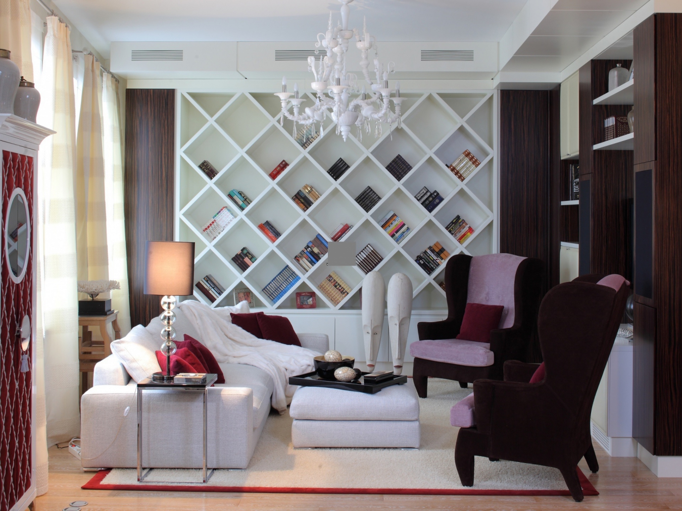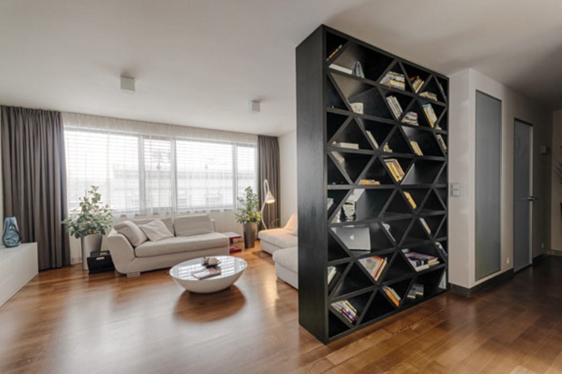 - Étagères, losanges. Ces délimiteurs aideront à ajouter une touche à l'intérieur. Ils servent à la fois d'élément de décoration et de détail fonctionnel. Leur aspect transversal crée une sensation de légèreté.