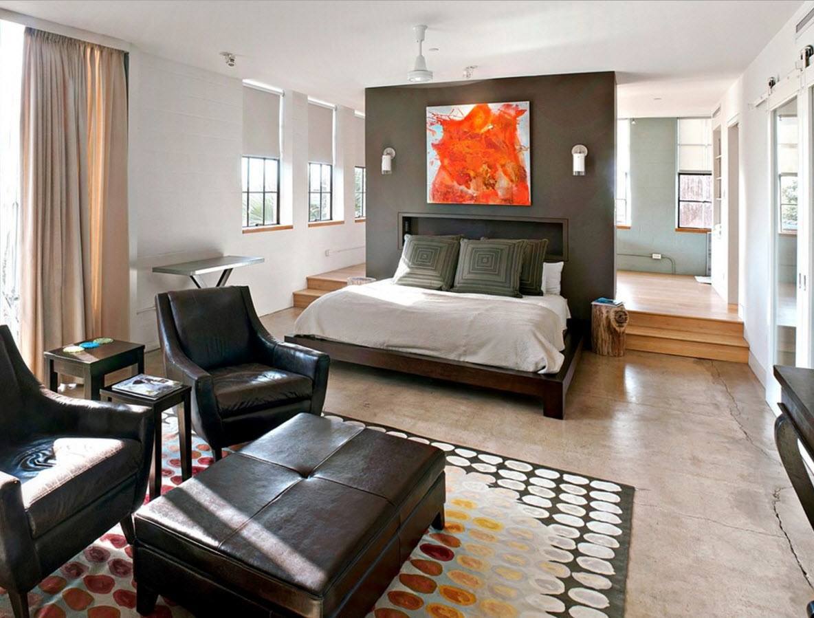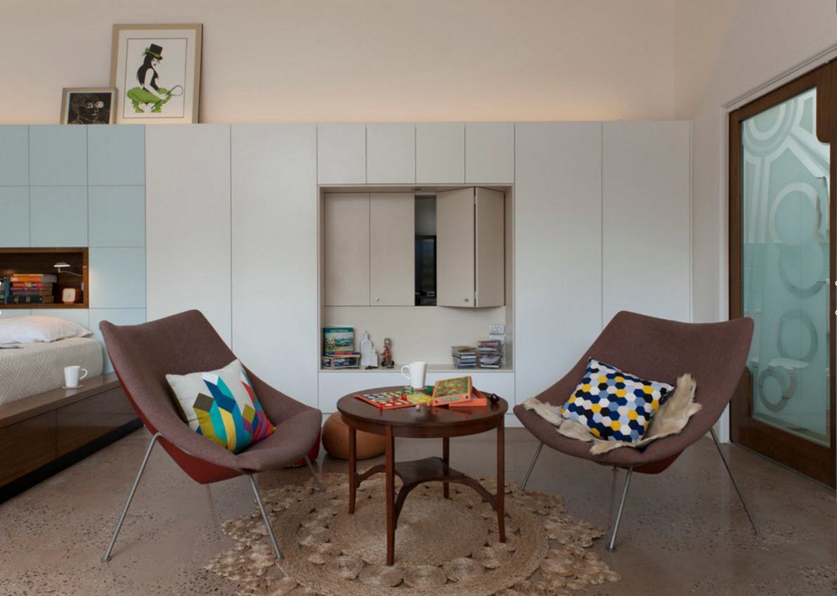L'espace de couchage qui en résulte peut accueillir un lit double avec de petits piédestaux. Il y a une place pour une armoire. Continuez l'intégrité du bureau intérieur contre le mur.