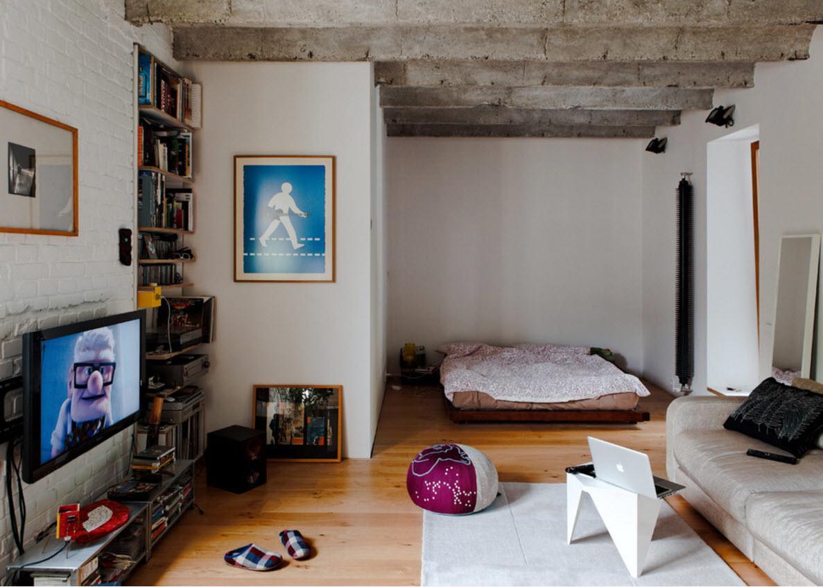 La petite pièce est divisée en zones au moyen d'une cloison d'une structure rotative. Il contient un téléviseur, un système d'enceintes. Pouf noir et canapé blanc complètent le tableau.