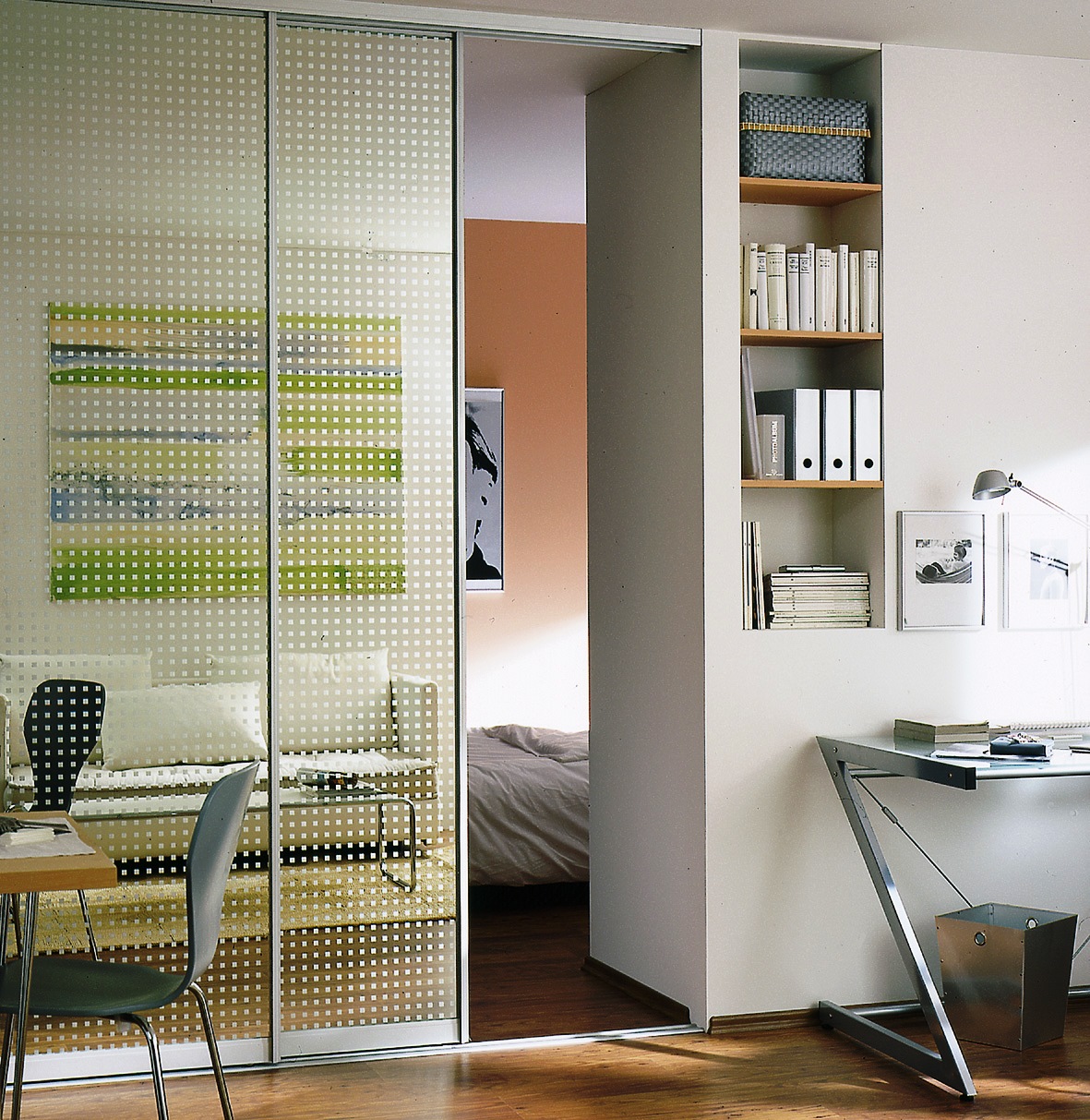 Cloison coulissante légère avec verre dépoli sur cadre en bois