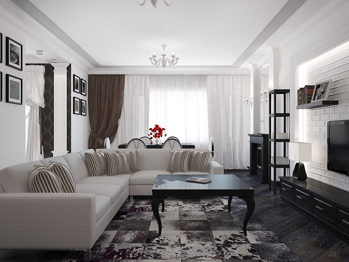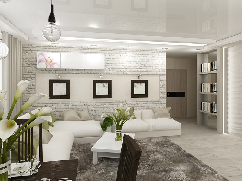 Cette option intérieure ne peut pas être rendue bon marché. Malgré son apparence bon marché - c'est une impression complètement trompeuse. Le meuble et les meubles rembourrés, ainsi que d'autres éléments décoratifs, doivent être aussi linéaires que possible ou avoir des lignes lisses en plastique.