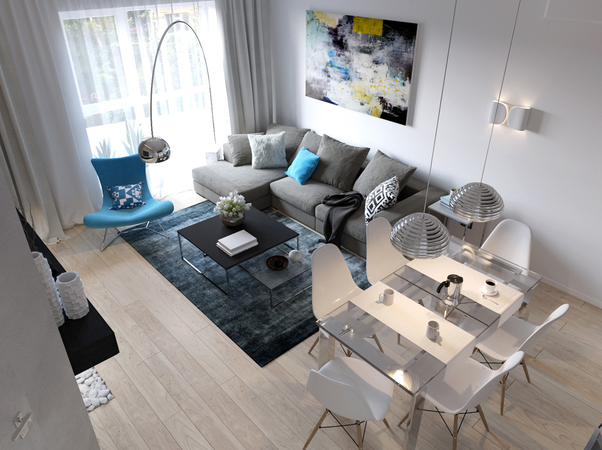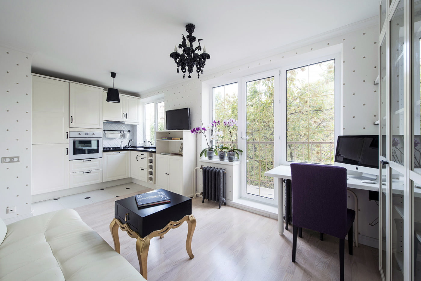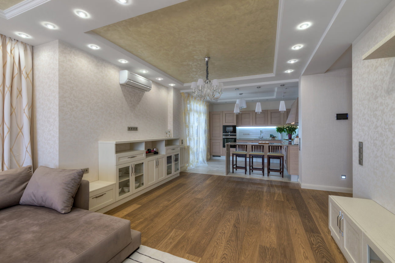 Des couleurs claires et chaudes, des matières naturelles, le confort sont ici importants. Il est recommandé de souligner le sol avec un stratifié à l'ombre du «chêne blanchi» - c'est la tendance de la saison et le design des salons.