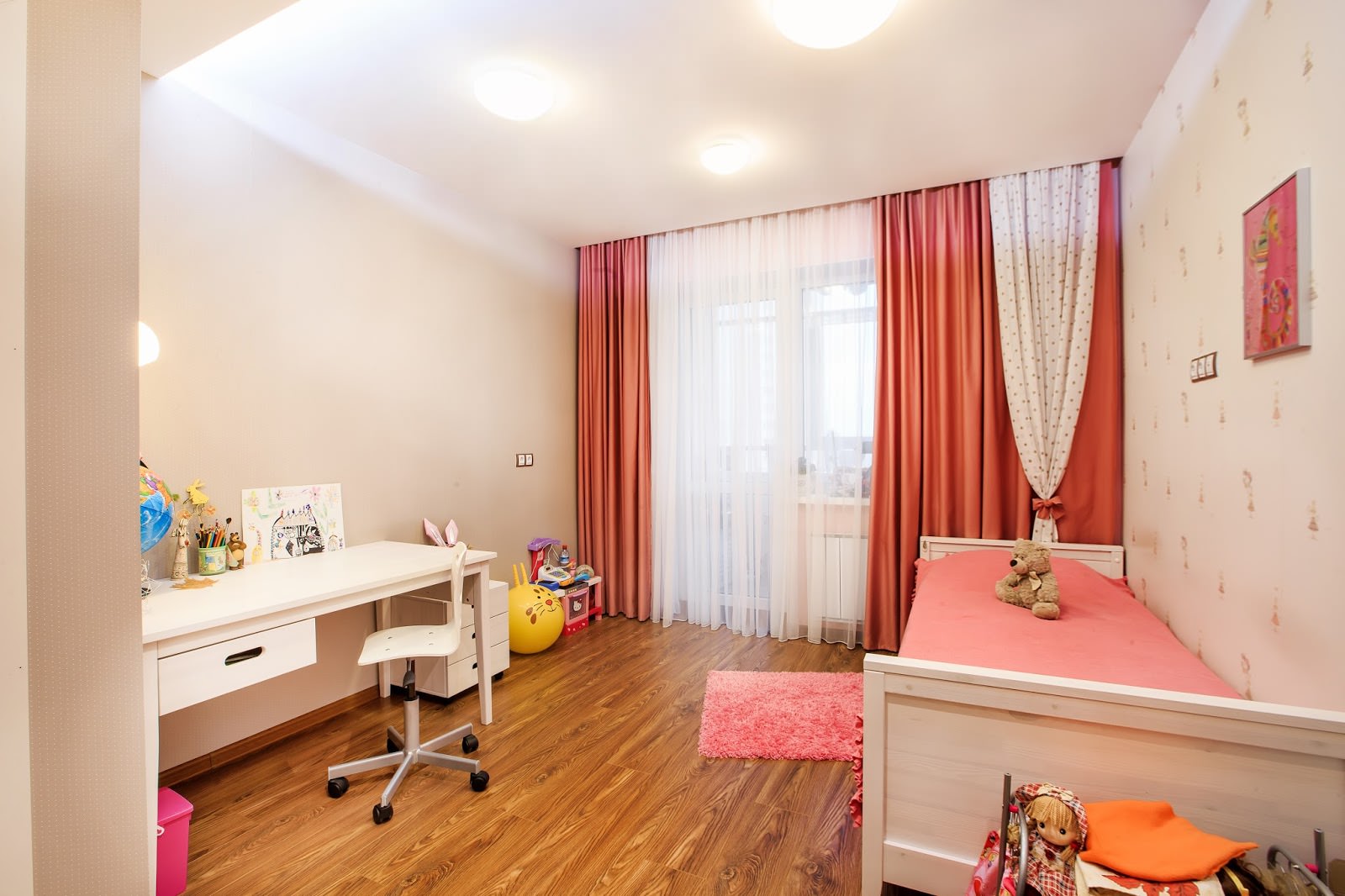 Le sol de la chambre des enfants doit être respectueux de l'environnement - résistant à l'usure, classe 32, durable et pratique. Convient pour créer un sol chaud. Il diffère par ses caractéristiques hydrofuges - si de l'eau est renversée, le revêtement ne monte pas.