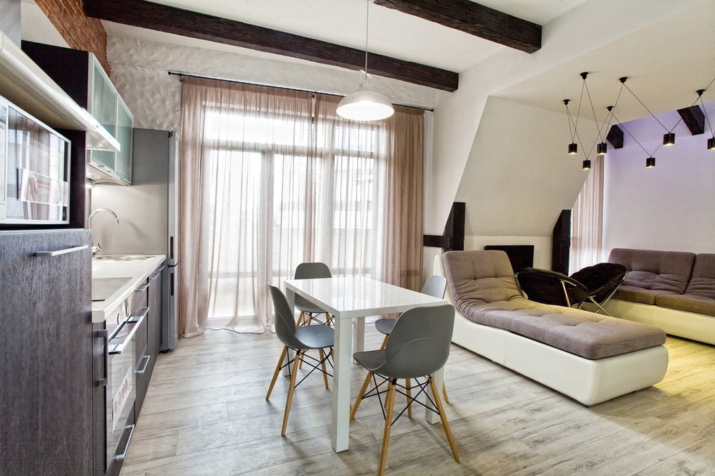 La salle à manger doit être libre et sans piles. Le casque peut être petit et s'intégrer à l'intérieur de l'appartement. Il est pratique de séparer le salon et la chambre avec un mur en plaque de plâtre, qui ne prend pas beaucoup de place.