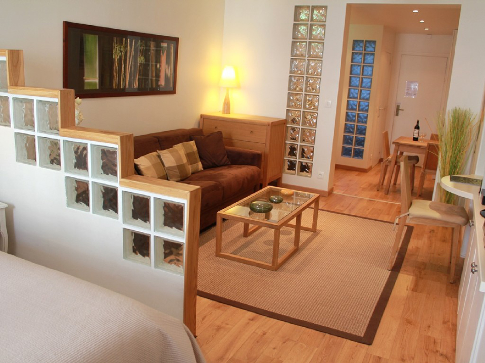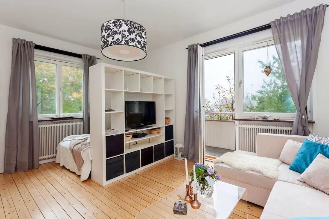 De tout le monde, vous pouvez obtenir un studio, que les clients apprécieront. Une petite zone peut être divisée par un rack ou un grand placard. Cela divisera visuellement les pièces en zones appropriées.
