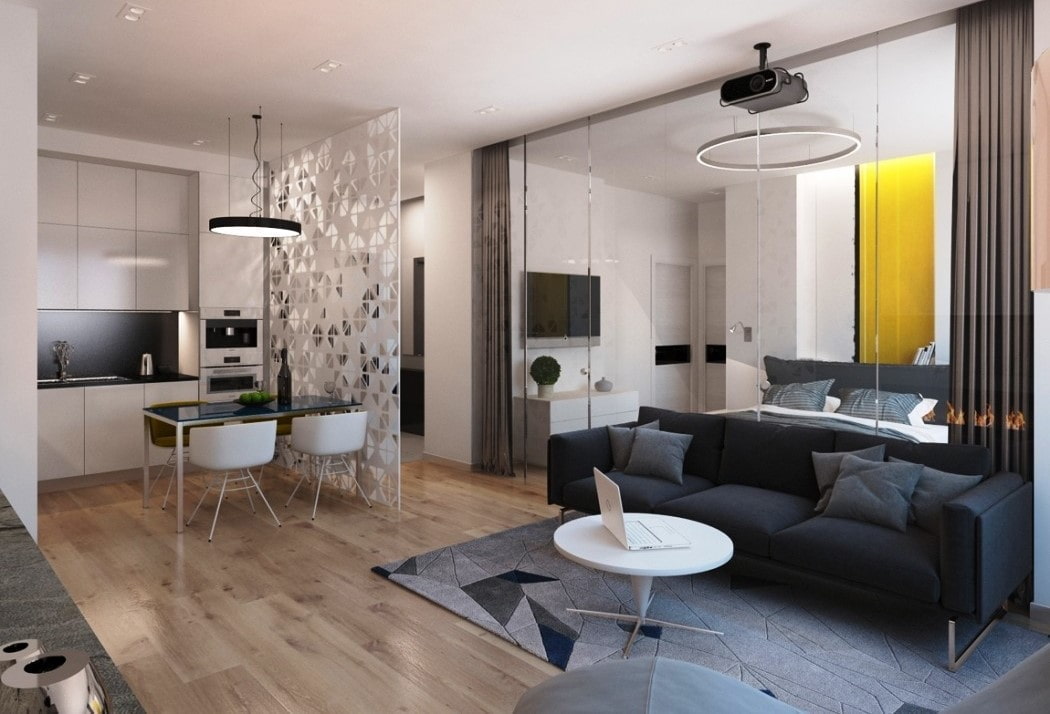 À 50 m², vous pouvez obtenir une chambre confortable dans une moitié et un coin salon séparé dans l'autre. En tant que partition, vous pouvez mettre transparent. Cela donnera à la pièce un look moderne et présentable. L'appartement peut être une cuisine combinée avec salon et une chambre séparée. Tout cela peut être une option pratique pour les couples.