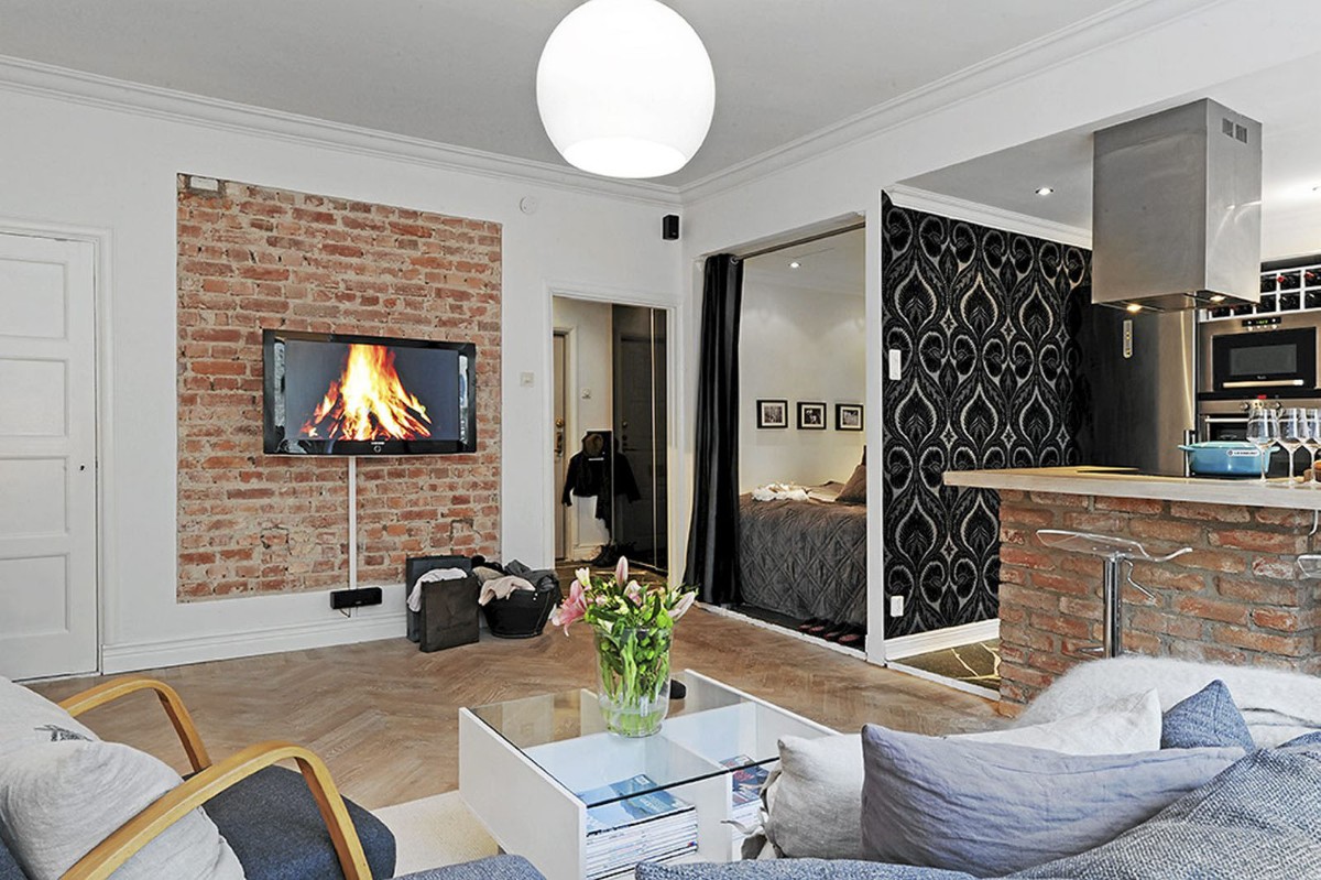 En utilisant différentes couleurs, vous pouvez rendre un odnushka converti en une pièce kopeck plus spacieux. Du papier peint imitant un mur de briques peut être collé dans le salon. Ici, vous pouvez mettre un canapé eurobook, ainsi qu'une armoire. Un petit lit pliant convient à la chambre.
