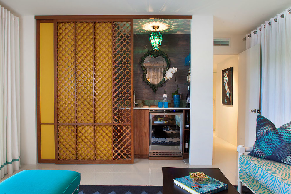D'un appartement d'une pièce, vous pouvez obtenir un appartement de deux pièces. Pour séparer les pièces, vous pouvez installer une porte battante ou coulissante. Il aura l'air inhabituel, mais donnera également à l'intérieur un look spécial. Cela peut économiser une zone carrée.