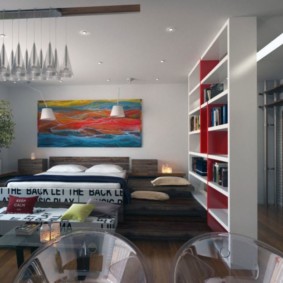Dans le salon, il est recommandé de préparer un coin couchage, de mettre un lit. Lors du zonage, il est recommandé d'utiliser des demi-murs en miroir, des panneaux de télévision, des murs transparents avec des écrans, des cloisons.