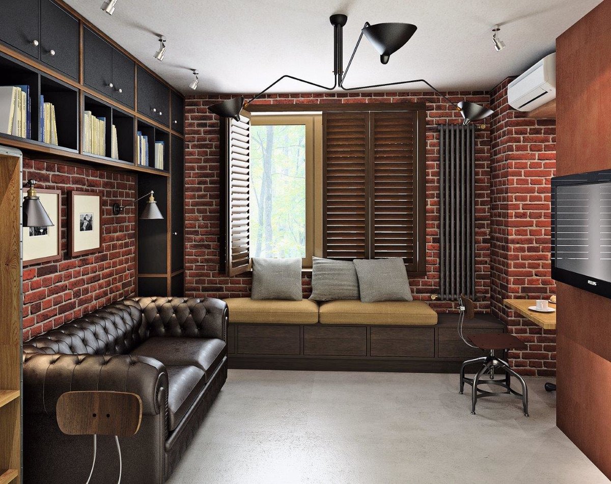 Important! Si vous voulez un intérieur original - organisez des étagères ouvertes avec des livres, décorez un mur de briques avec une grande carte du monde ou un organisateur.