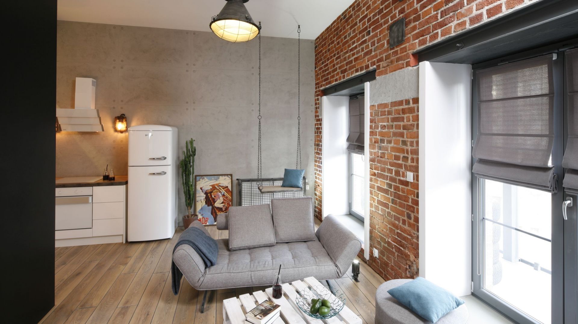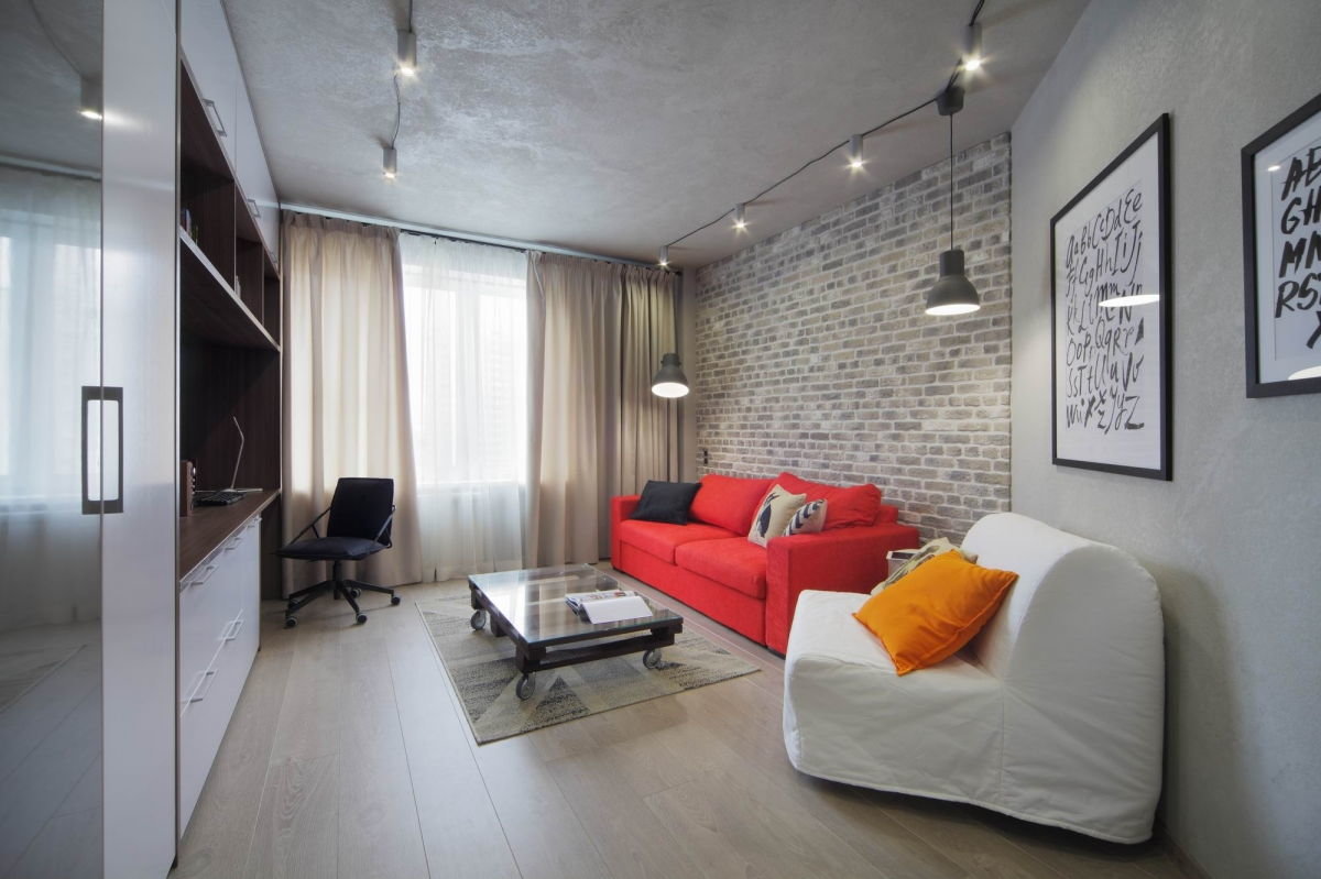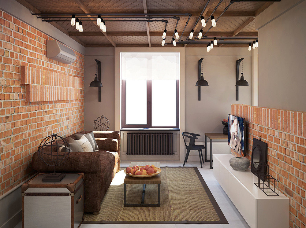 Le style loft de la conception de l'appartement le rend industriel. Par conséquent, vous pouvez laisser des murs non traités. Mais pour les rendre vraiment stylés, vous avez besoin d'une main du maître.