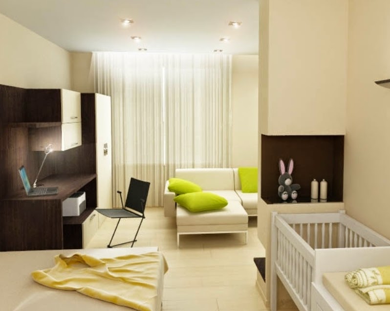 - Minimalisme Un petit canapé pliant, un petit berceau, une table combinée pour les repas et pour le travail. Un détail important est les armoires encastrées. Ils ne se démarquent pas du style du minimalisme, tout en aidant à accueillir une grande partie des effets personnels.