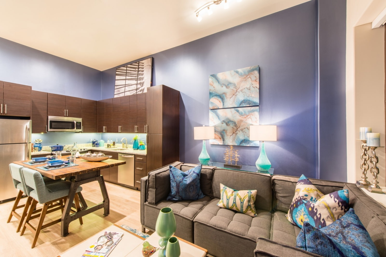 Un canapé situé au centre de la pièce divisera l'espace en un coin salon et un coin cuisine