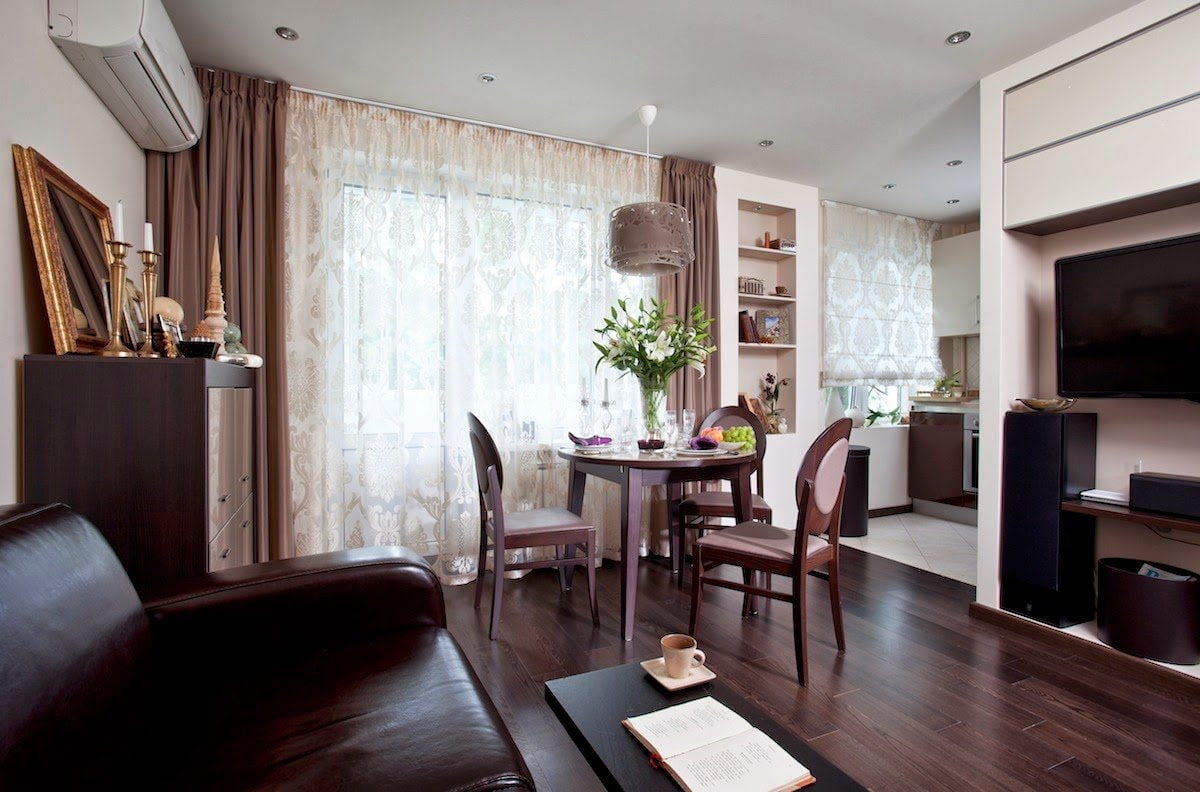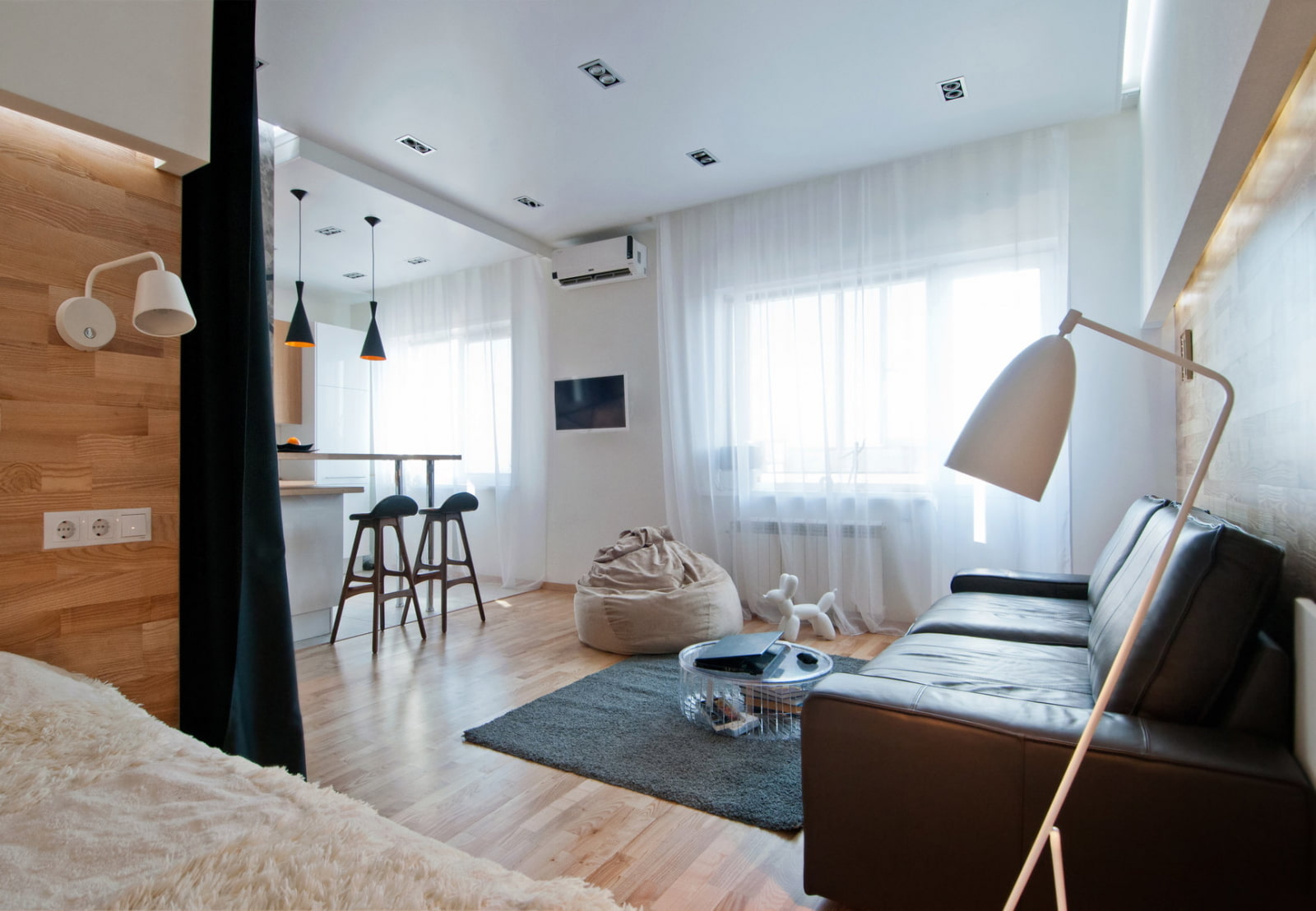 Malgré la petite taille de l'appartement, avec un design responsable, vous pouvez recréer l'illusion de différentes zones de pièce, sans même utiliser de réaménagement.