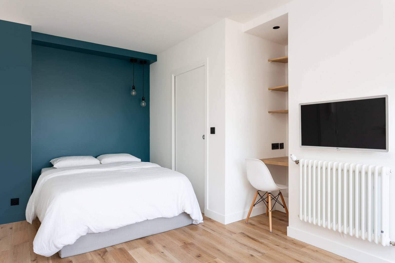 Intérieur lumineux d'un studio, dans lequel un rideau est utilisé pour séparer la zone de couchage de l'invité