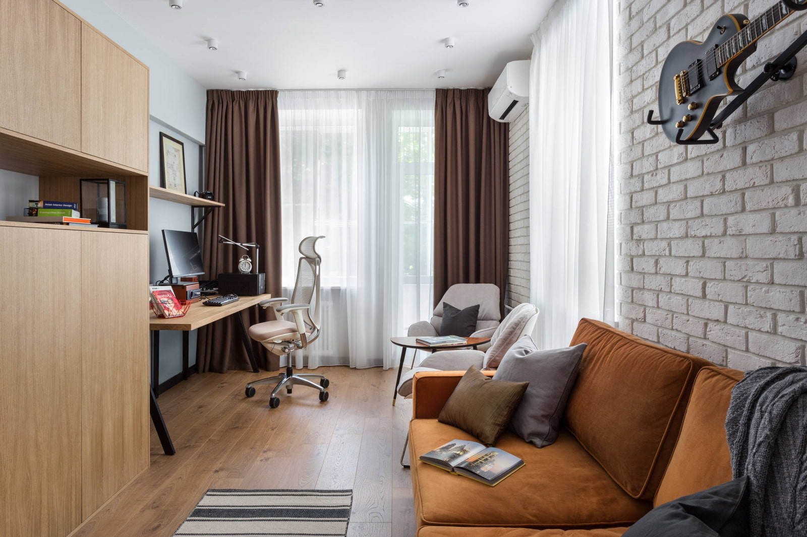 Pour limiter cette surface, il suffira de mettre un bureau et une bonne chaise confortable. Il est conseillé d'attribuer un espace de travail dans le coin de la pièce afin que lorsque vous êtes dans la zone de loisirs, vous n'ayez pas à entrer en contact avec le bureau. Cela permettra de travailler calmement même si quelqu'un d'autre est dans l'appartement.