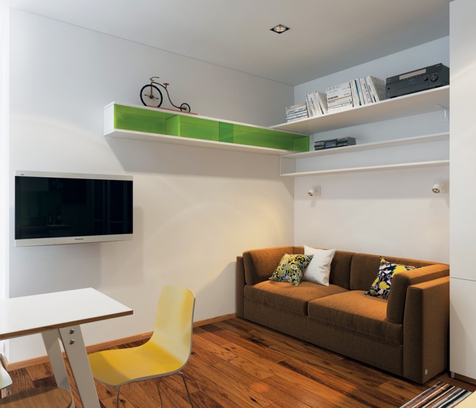 - Remplacez le lit habituel par un canapé et en combinaison avec une table basse sur roulettes, ils représenteront parfaitement le salon.