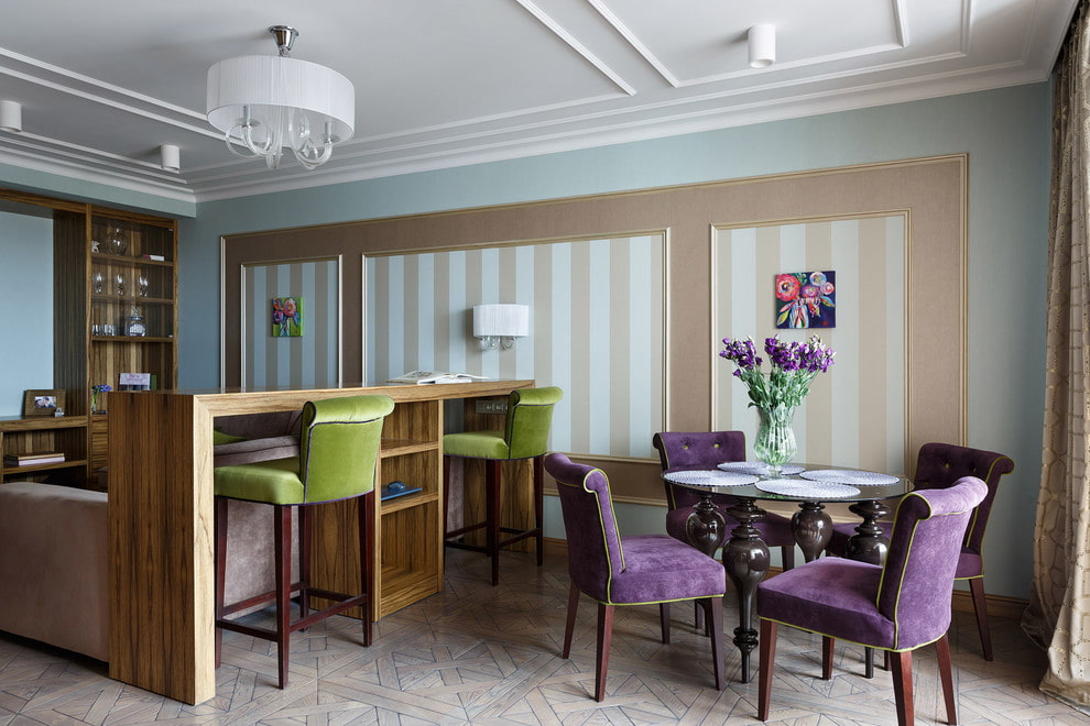 Les murs peints de différentes couleurs ou à moitié doublés créent un effet intéressant dans la pièce et donnent à l'intérieur une modernité et une créativité.