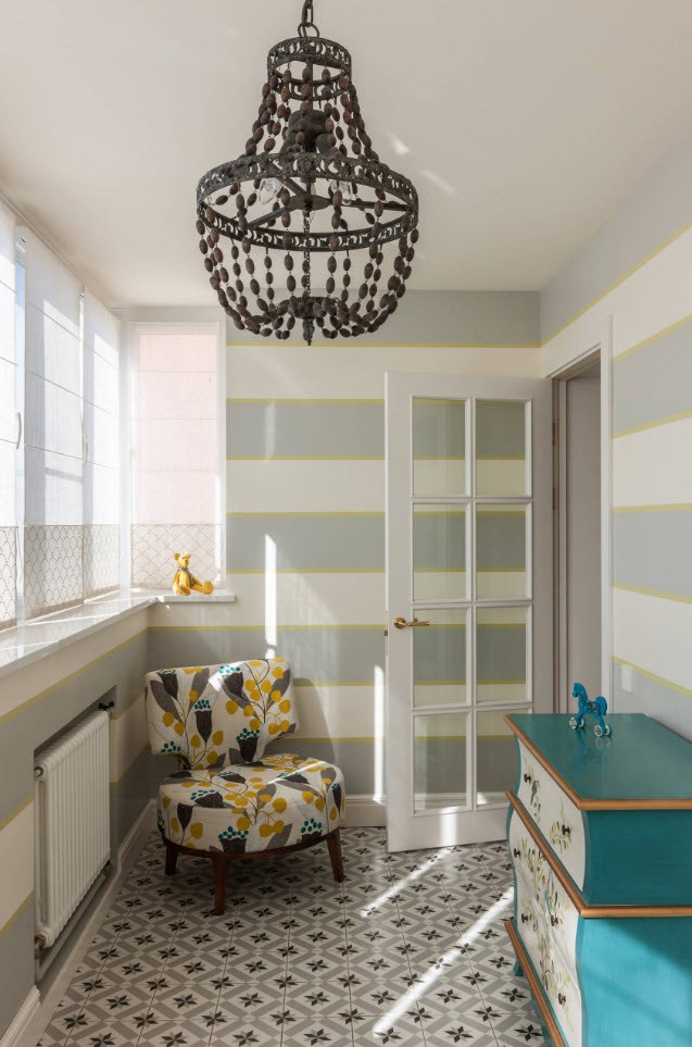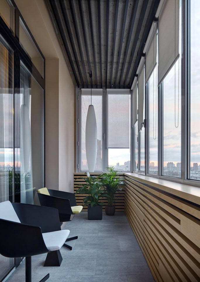 Une autre option de finition budgétaire. Soit dit en passant, il est activement utilisé non seulement pour le plafond de la loggia, mais aussi pour la conception de l'espace au plafond dans la cuisine, dans la chambre ou le couloir. Une telle tuile est un excellent isolant thermique. Il est également apprécié pour sa facilité d'installation - les plaques sont collées au plafond, puis fixées en plus avec des chevilles. Si vous le souhaitez, une couche de peinture texturée ou de plâtre décoratif est appliquée sur les plaques. Laissez-nous un décor concis.